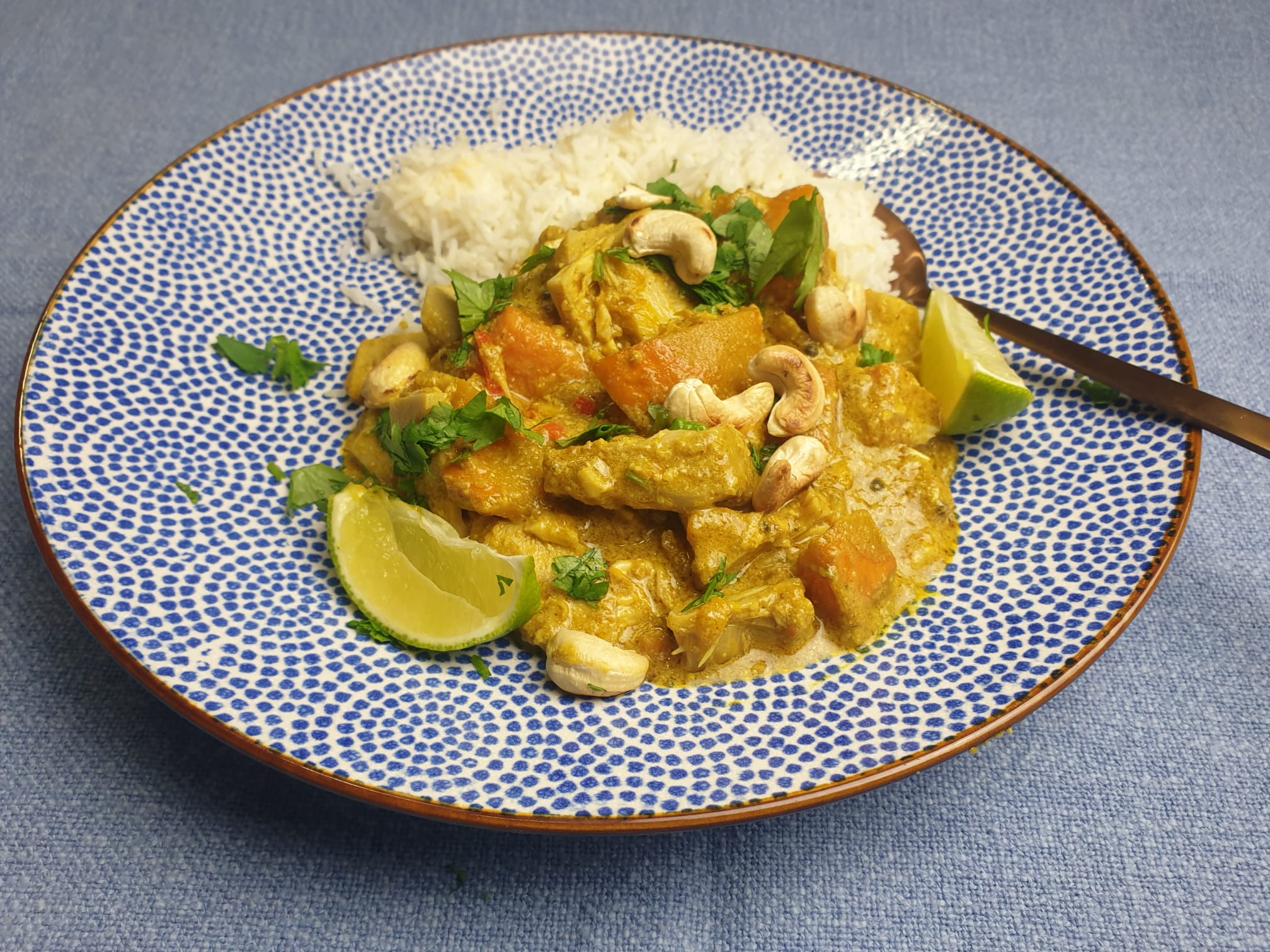 Week 50 g van de cashewnoten en zet ze te weken in een grote beker heet water. Pel de uien en knoflooktenen, snipper beide. Maak de rode peper schoon (de pitjes zijn het heetst, dus daar kan je mee variëren) en hak die fijn. Verhit de olie in een diepe pan en doe de mosterdzaadjes erin en een deksel op de pan. Wacht tot je de mosterdzaadjes hoort knapperen en voeg dan de ui en knoflook toe. Fruit het glazig en voeg dan de peper toe, laat bakken op zacht vuur. Maak de pompoenschoon (wassen, lelijke plekjes eraf en de steel en pitjes verwijderen) en snijd in mooie blokjes. Voeg ze toe aan de pan, bak eventjes en voeg dan alle kruiden toe. Bak totdat je alle kruiden lekker ruimte en voeg dan het bouillonblokje, het blik kokosmelk en wat water toe en laat met een deksel op de pan zachtjes pruttelen, roer af en toe en voeg wat water toe als het teveel aanzet. Zet nu ook de rijst op en laat de jackfruitstukjes even uitlekken in een vergiet. Stoof de pompoen tot ze zacht is, dat duurt 15-20 min. Snijd de jackfruitstukjes in kleine reepjes en stoof de laatste 5 min. mee met de curry. Pureer de geweekte cashewnoten met het water en voeg dit ook toe aan de stoofpot. Rooster de rest van de cashewnoten (die je niet had geweekt) kort in een droge koekenpan, zodat ze net een beetje kleuren. Serveer de curry met de rijst en strooi er de geroosterde noten over en eventueel wat vers gehakte koriander en een partje limoen.