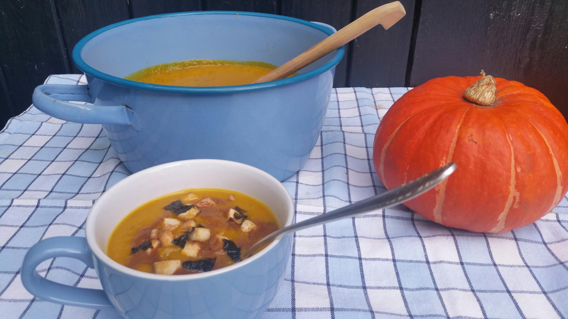 Ui en knoflook pellen en fijn snipperen en zachtjes fruiten in 2 el olie. Bleekselderij wassen en in boogjes snijden en toevoegen. Pompoen wassen en de lelijke plekjes en onder- en