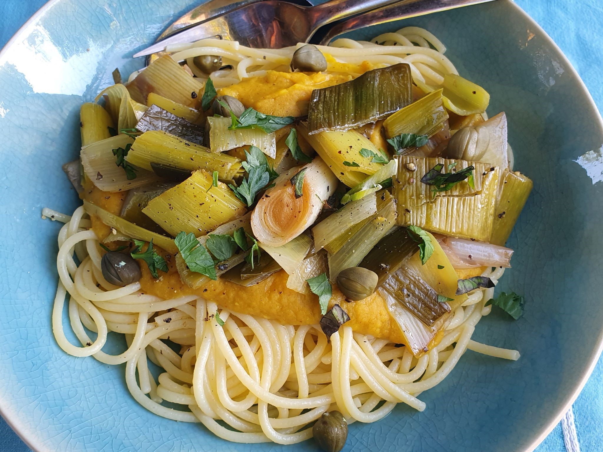 Prei, pasta en rode linzensaus