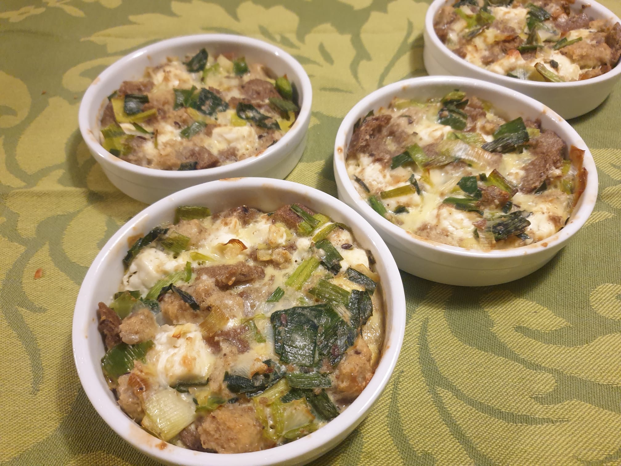 In vroeger tijden ontstonden de lekkerste recepten door restjes te verwerken. Strata is eigenlijk een hartige broodpudding, die je maakt van geweekt brood en groente. Het brood week je in ei en zo ontstaat bij bakken een heel lekkere structuur. Ik maakte het met prei, maar je kunt allerlei (restjes!) groente verstoppen in deze schotel. En met kaas en misschien zelfs spekjes wordt het natuurlijk extra smakelijk. Lekker met een frisse salade erbij!