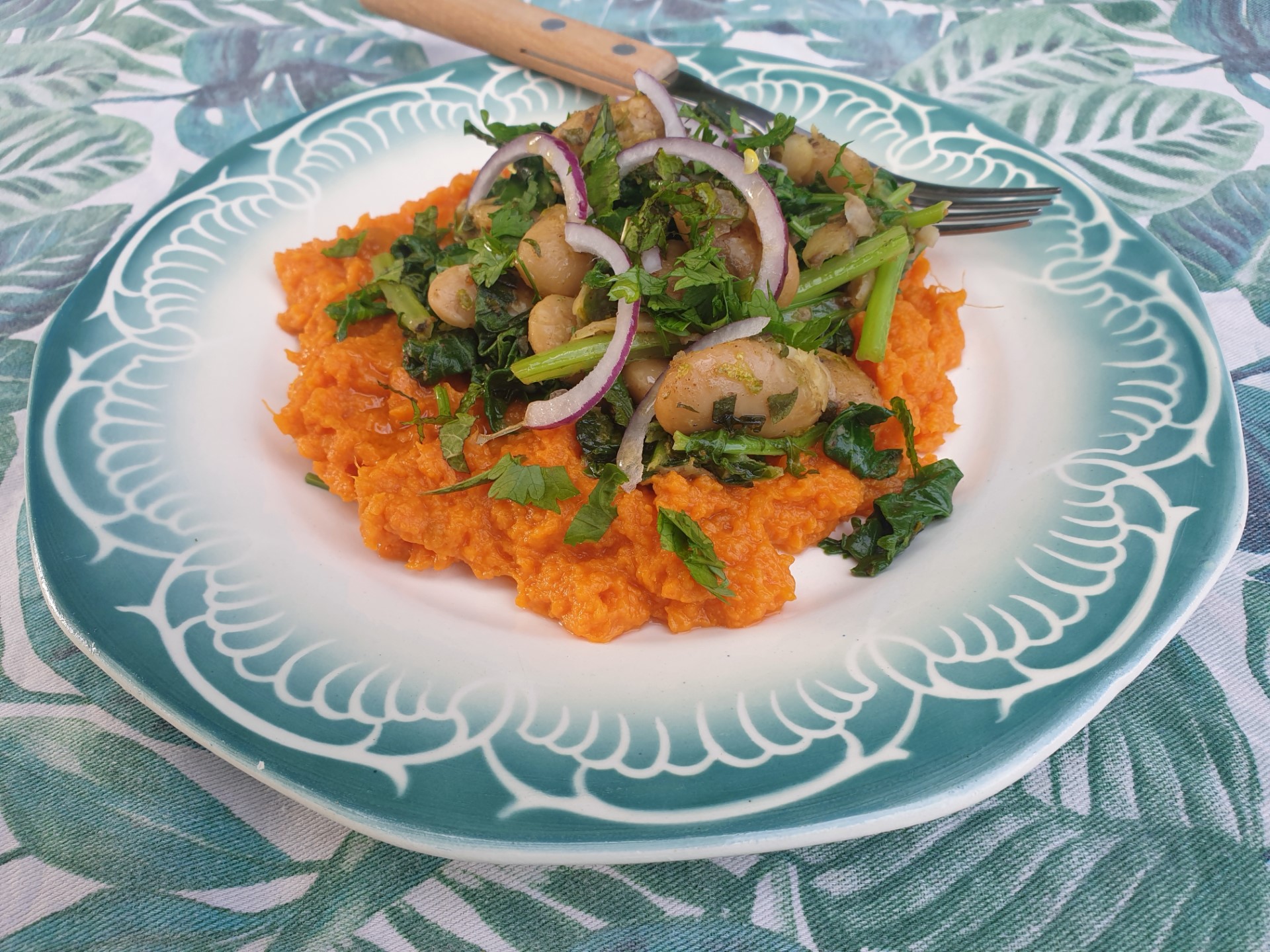 Raapsteel met bataat, limabonen en tuinkruiden