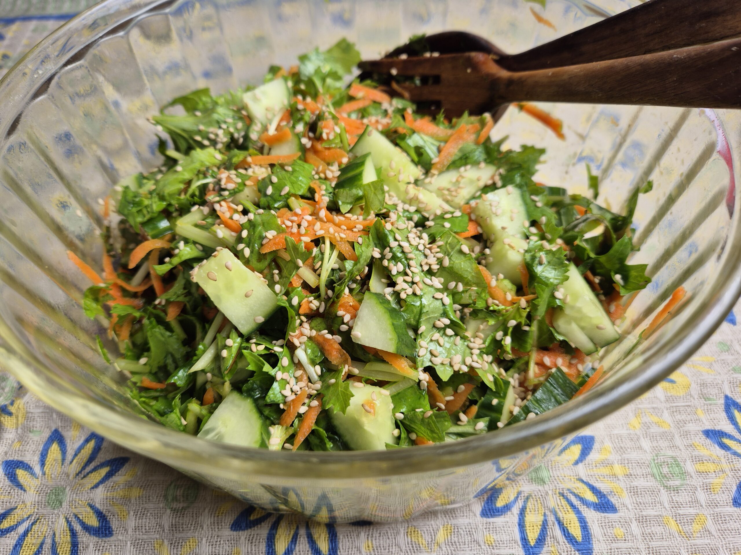 Mmm, heerlijk, frisse blaadjes in het voorjaar! Je kan natuurlijk de raapsteeltjes in een Hollandse stamppot stoppen, maar deze salade met een beetje Oosterse twist is ook een aanrader! De smaakmakers zijn limoen, tamari en geroosterde sesamolie. Vooral die laatste is echt een topper om je gerechten wat meer diepte te geven, een lepeltje is al voldoende. Wanneer je het in warme gerechten stopt, voeg je het liefste het pas ná het koken toe, zo blijven de meeste voedingsstoffen behouden. Deze salade is lekker bij gebakken aardappels en vis of gebakken tofu. Met gekookte quinoa en een blik uitgelekte kikkererwten of kidneybonen tover je deze salade om in een maaltijdsalade, misschien dat je dan beter twee bosjes raapstelen gebruikt.