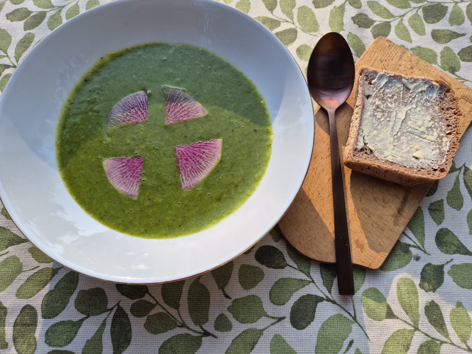 Die mooie Chinese radijzen hebben heel veel blad, dat je prima kan verwerken in een gerecht. Stoof het als groente, doe het door een stamppotje of maak deze knalgroene soep, hij is echt heel lekker!