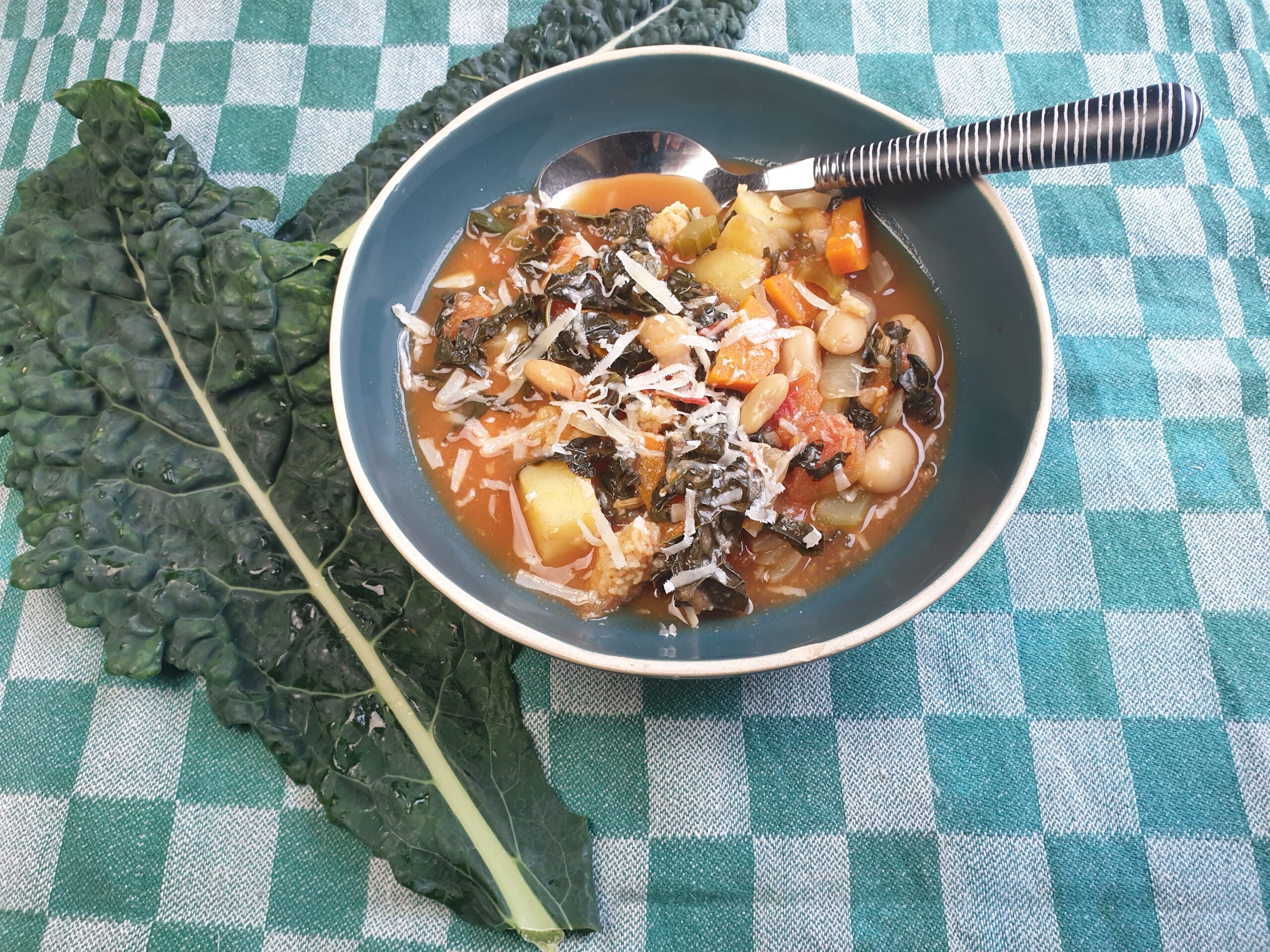 Week de witte bonen de nacht ervoor en kook ze in een uur of meer gaar met de tomaat geplet en het laurierblaadje. Of gebruik een blik bonen. Maak ook alle andere groente behalve de palmkool, die kan straks, schoon en snijd in stukjes. Neem een ruime pan met een dikke bodem en fruit in een scheutje olie de gehakte ui glazig. Voeg dan wortel, bleekselderij, aardappel, knoflook, chilipoeder en tijm of venkelzaad toe en laat met een deksel schuin op de pan 15-20 min. zweten. Was intussen de palmkool, haal de dikke nerf eruit en snijd in niet te fijne reepjes. Voeg de bonen (uitgelekt), de bouillontabletten en ongeveer een halve liter water toe en breng aan de kook. De tomaat en het laurierblaadje kunnen nu ook in de pan, als je bonen uit blik gebruikt. Voeg als de soep kookt de palmkool toe en de gepelde tomaten. Laat ongeveer 20 min. koken. Voeg het oude brood toe aan de soep en kook nog 10 min. mee. De soep moet dik worden, maar geen puree, dus misschien moet er nog wat water bij. Laat de soep het liefst een nacht staan en warm de volgende dag weer op, serveer met een scheut olijfolie en wat Parmezaanse kaas.