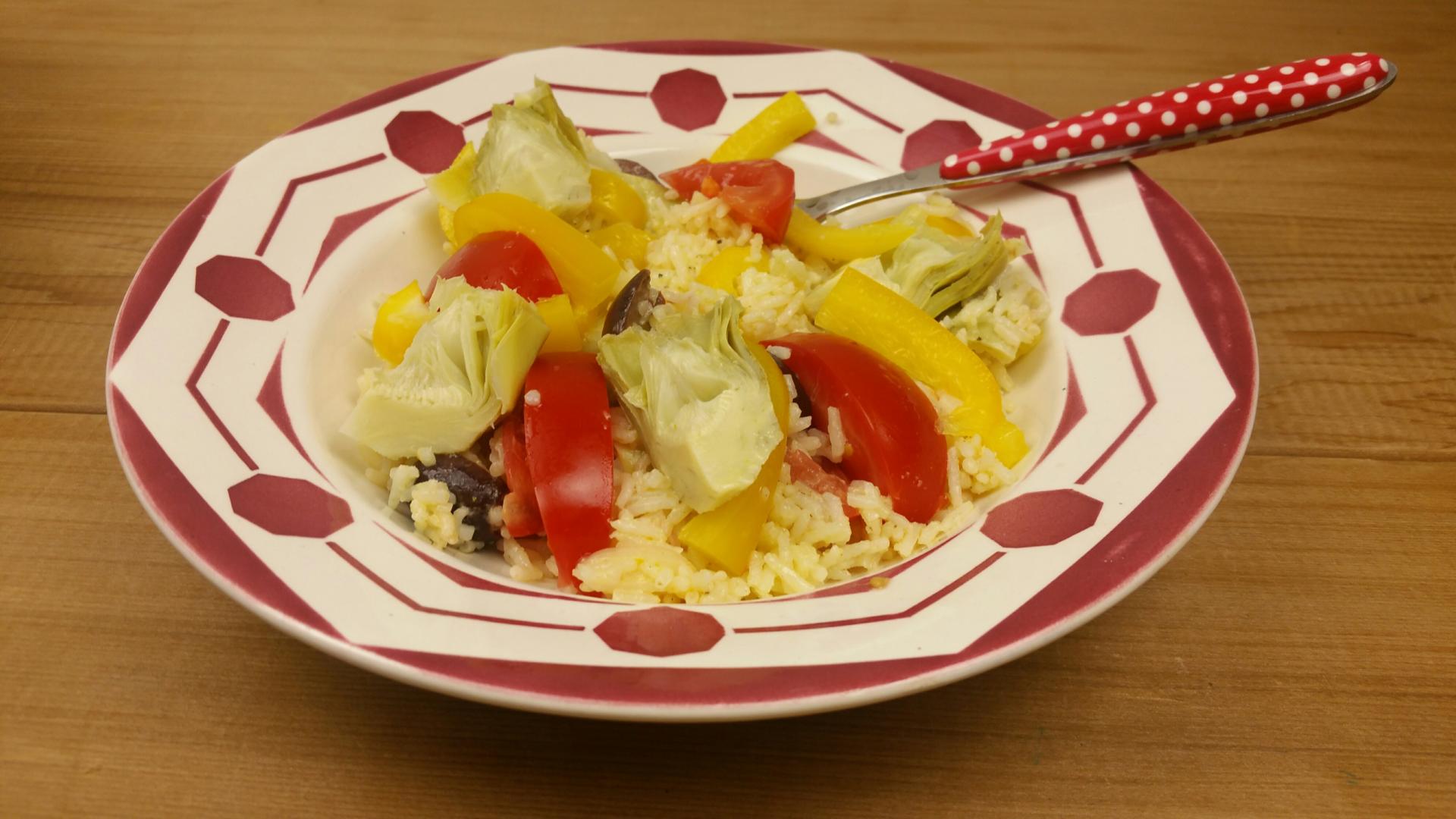 200 g rijst, 1 gele paprika, 1 sjalotje, 10 olijven, 1 blik of pakje artisjokkenharten, 2 tomaten, 2 el olie, 2-3 el mayonaise, 1 mespunt kerriepoeder, versgemalen peper, citroensap