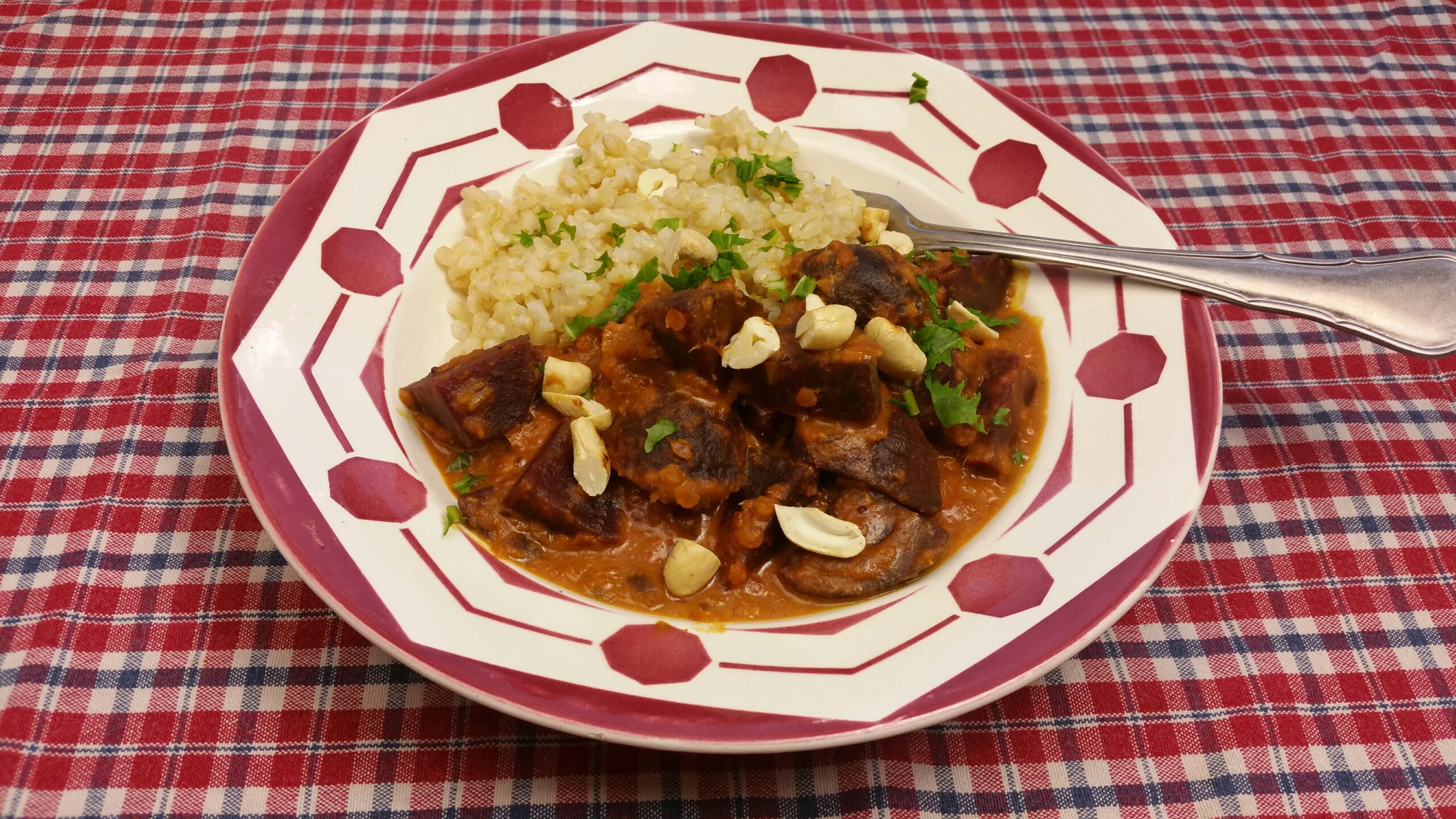 700 g rode bieten, 1 rode ui, 2 tenen knoflook, 1 duimpje verse gember, 1 tl mosterdzaad, 1 tl komijnzaad, ½ tl chilipoeder, ½ tl kaneel poeder, 1 tl kurkumapoeder, 2 el olie, 100 g rode linzen, 1 blik (400 ml) kokosmelk, p&z, handvol cashewnoten, eventueel wat peterselie of koriander