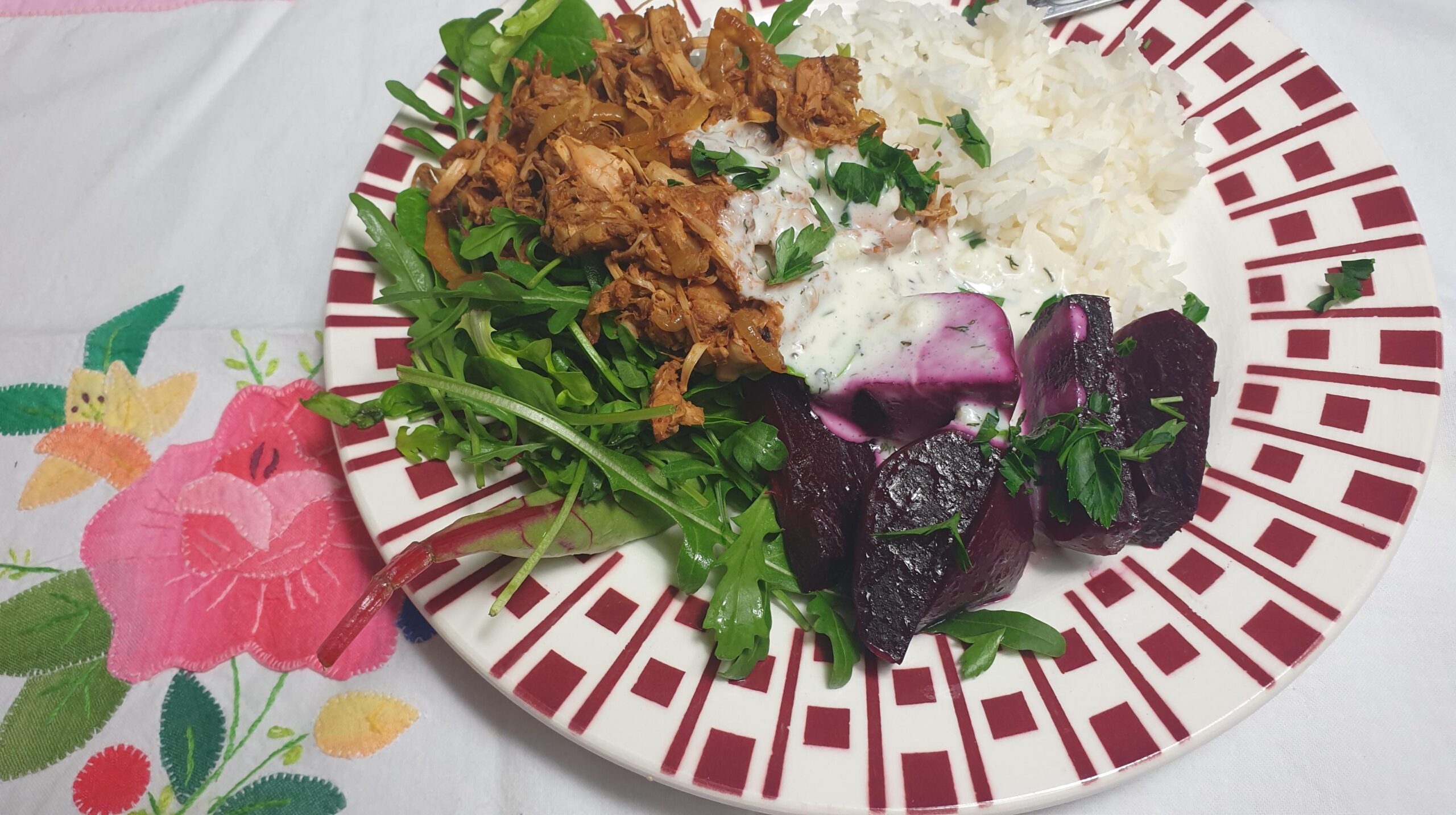 Spoel de bietjes af en kook ze in ruim water in 40-60 min. gaar in hun schil. Laat ze schrikken onder de koude kraan, snijd onder- en bovenkant af en wrijf het velletje eraf. Snijd in partjes. Dan de pulled jackfruit: kiep de jackfruit in een vergiet, spoel even af en laat uitlekken. Pel ui en knoflook, snijd de ui in halve ringen en hak de knoflook fijn. Bak in een ruime pan in een royale scheur olie de uien even aan en voeg dan de knoflook en de kruiden toe. Bak al omscheppend en voeg dan een beetje azijn, tomatenpuree en een lepeltje appelstroop toe. Voeg het jackfruit toe en bak al omscheppend. Na iets van 5 min. kun je met een vork of twee het vruchtvlees uit elkaar trekken tot leuke draadjes. Bak al omscheppend nog 5 min, proef voor zout en misschien nog wat shoarmakruiden of drupje azijn. Intussen maak je het yoghurtsausje. Lekker met verse koriander of peterselie, zoete aardappelfriet of rijst.