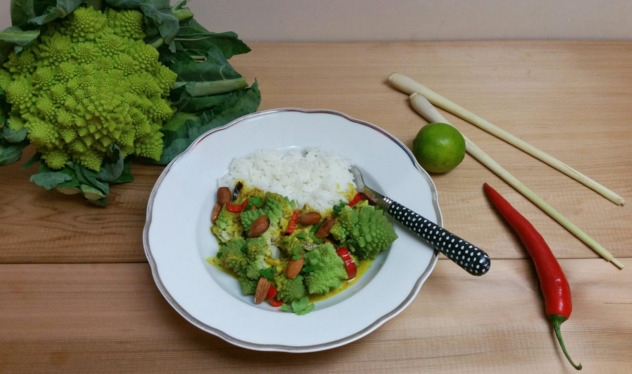 1 romanesco, 1 el kokosvet, 1 rode ui, 1 rode peper (optioneel), 1 stukje gember (ongeveer 1 el gehakt), 1 limoen, 1 stengel citroengras, 2 tl geelwortel (kurkuma), 2 tl gemalen komijn, 1 el garam massala, p&z, 1 blikje kokosmelk (400 ml), flinke handvol amandelen, verse koriander, 2 tl kokossuiker, p&z, eventueel ook vis, kip of tofu, naar wens