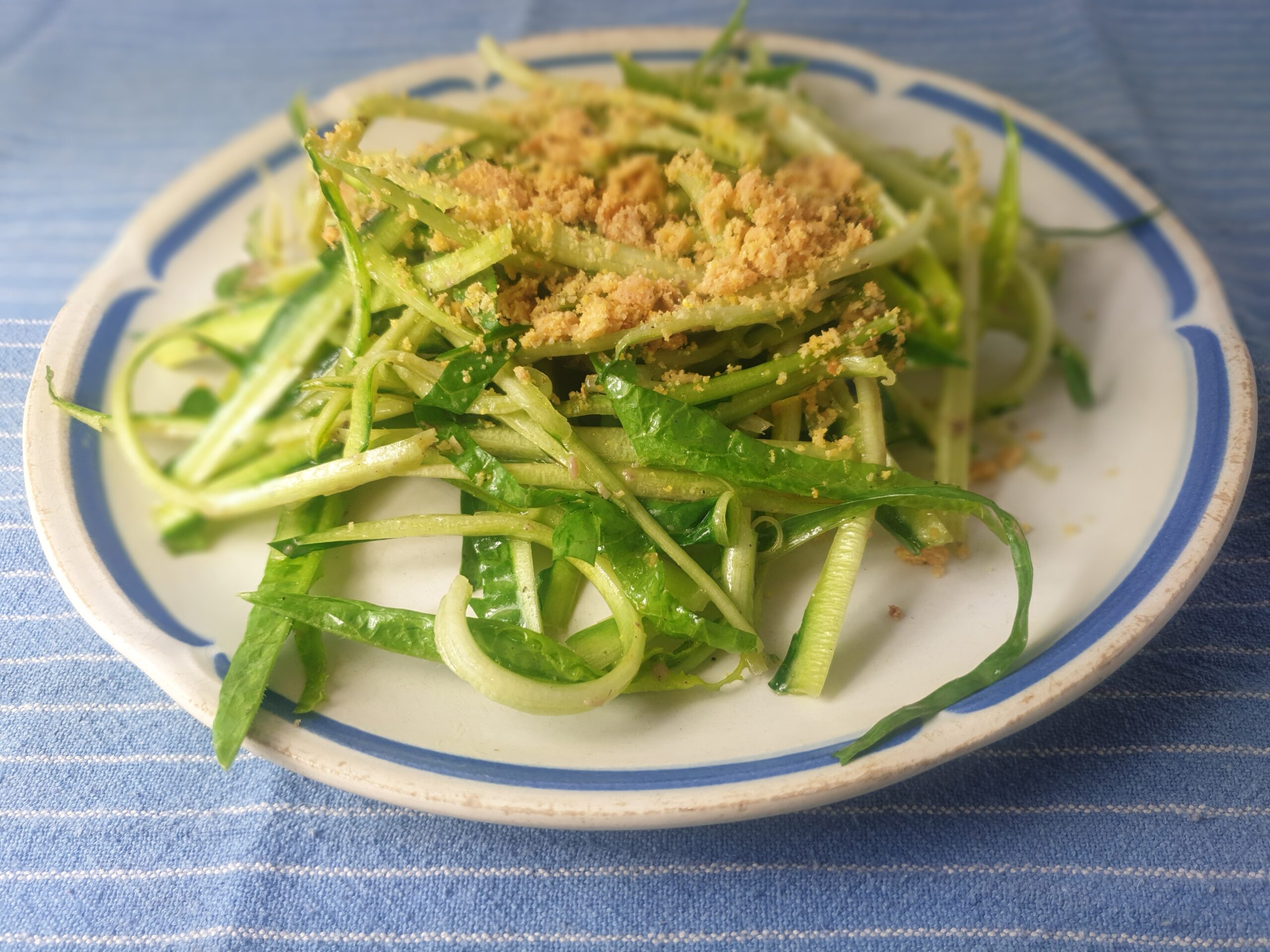 Was de puntarelle grondig. Voor deze salade gebruik je enkel de nerven en dikkere stelen van de puntarelle, eventueel groen blad ris of snijd je van de nerven en gebruik je voor een warme bereiding: bijvoorbeeld stoven met een teentje knoflook en een drupje balsamico (of iets wat je anders met andijvie zou doen).
