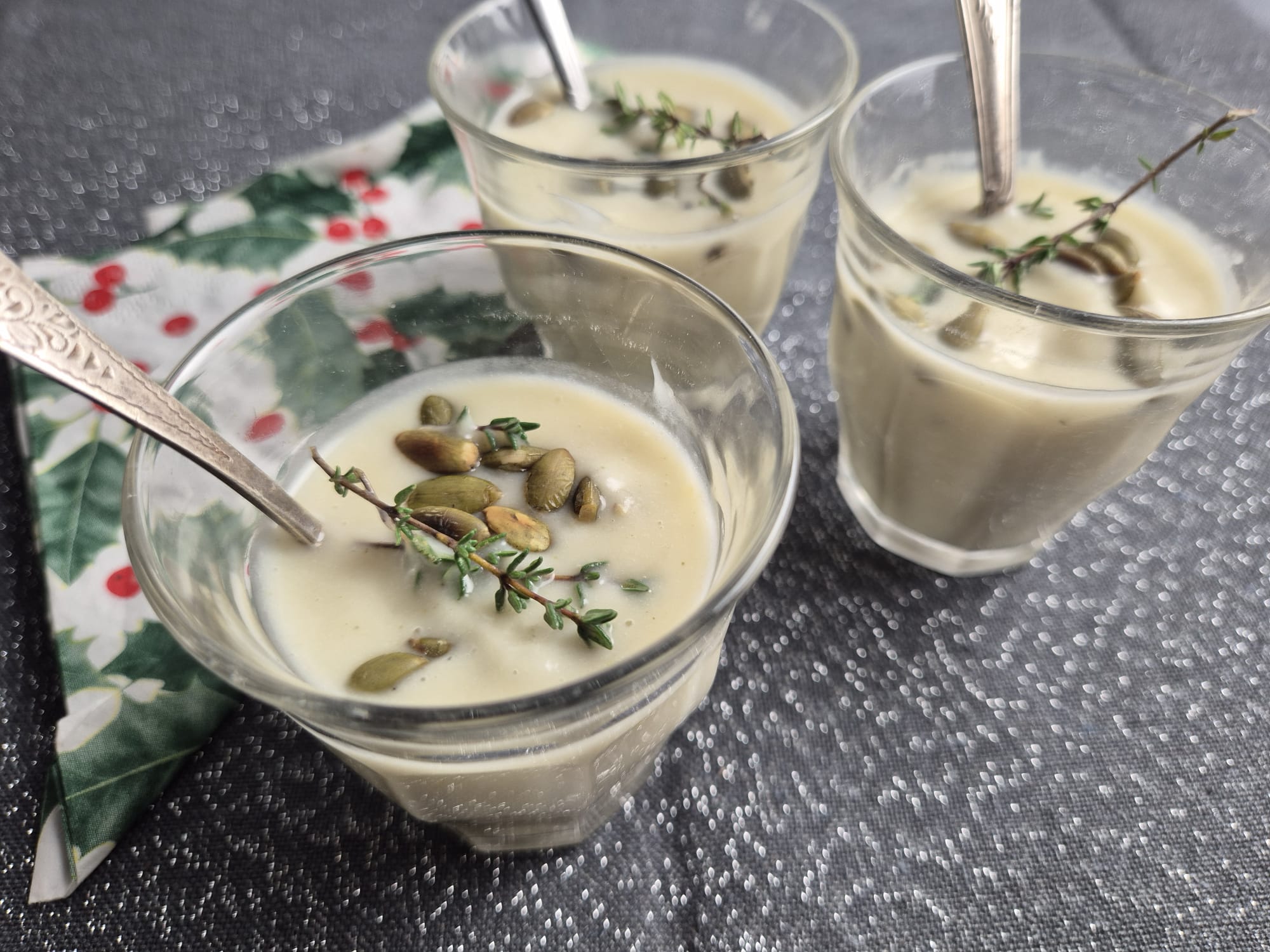 Deze bloemkoolsoep is aardig vullend, maar als je nu een klein beetje serveert, in een mooi glaasje, heb je wél de smaakbeleving maar blijft er genoeg trek over voor een vervolg van de maaltijd. Het is supersimpel! Met een blender in plaats van een staafmixer wordt je soepje echt heel zacht van smaak, of misschien heb jij wel een ouderwetse roerzeef, dat kan ook. De knapperige pitjes voegen echt iets toe!