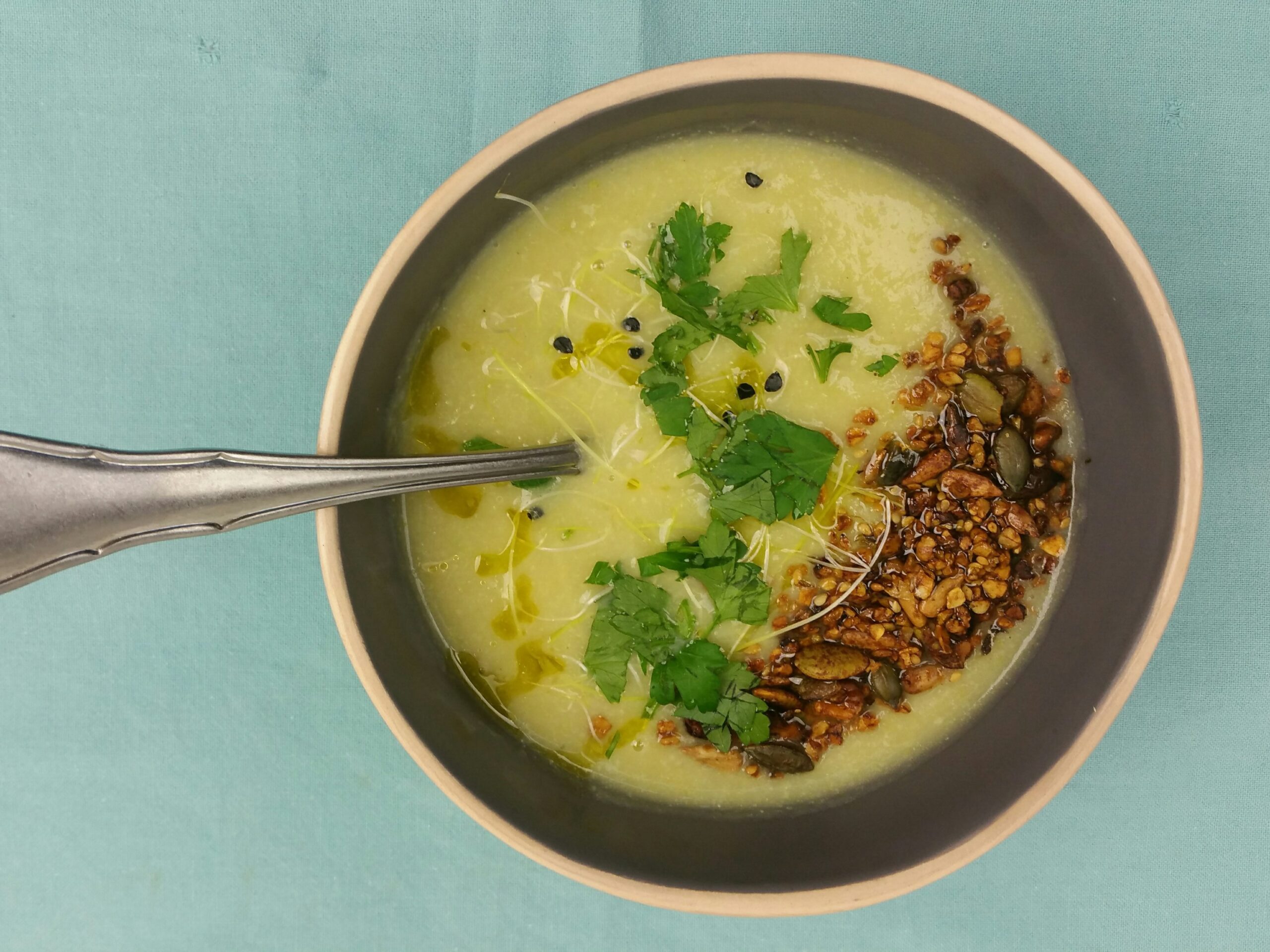 Een romig soepje zonder room? Het geheim is 1 aardappel! Wij maakten de soep speciaal met een zelfgemaakte granola, maar een eenvoudig geroosterd broodje smaakt natuurlijk ook heerlijk erbij! Tip vooraf: Wil je de granola bij je soep maken, begin dan daarmee!