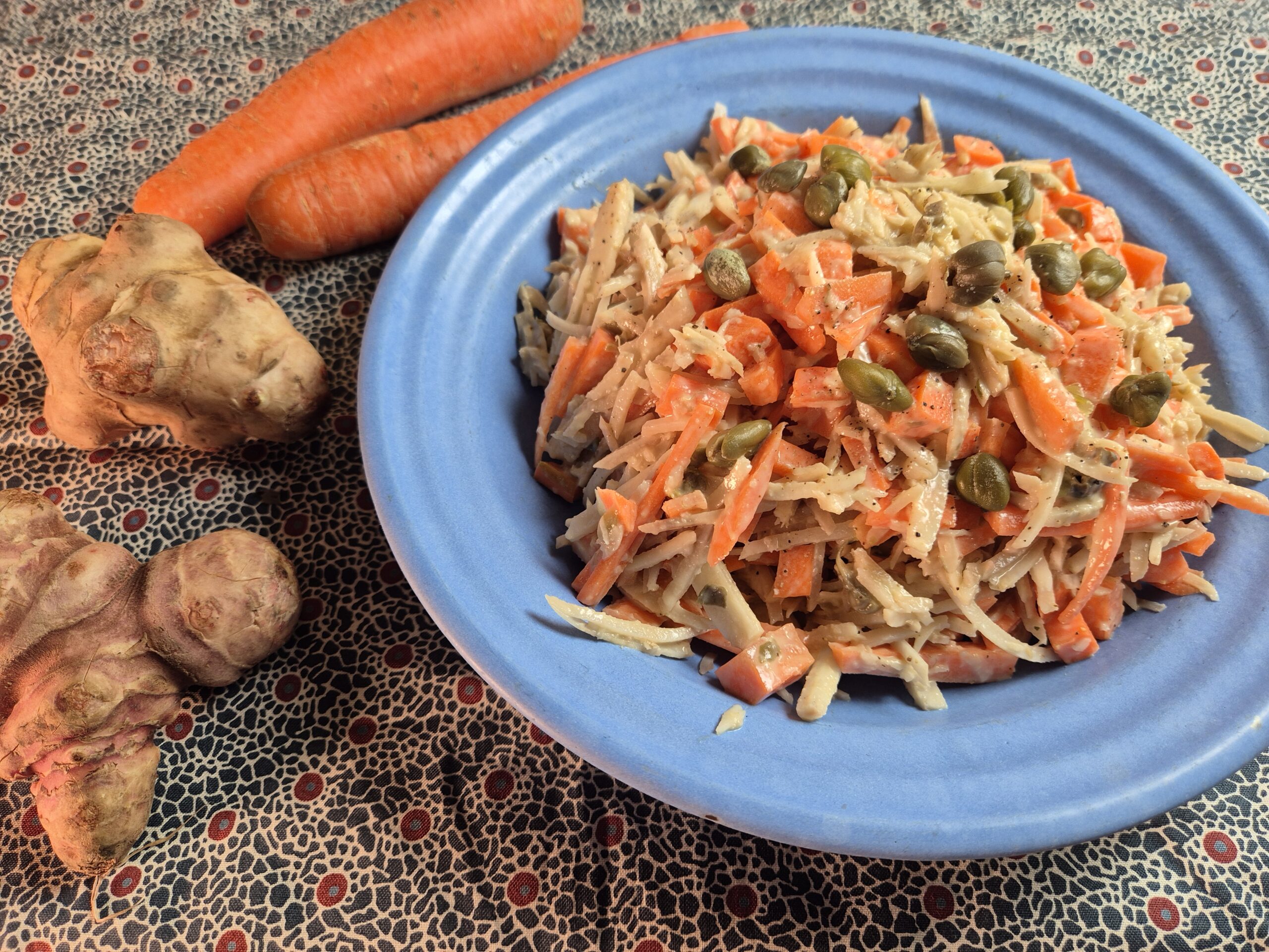 Supermakkelijk, deze salade van wortel en aardperen. Alleen dat schillen van de aardperen is even een klusje, maar met een goede dunschiller, die gewoon elk huishouden moet hebben wat mij betreft, is het zo gedaan. In een handomdraai maak je een lekker zacht smakende en knapperige salade. Aardperen zijn een niet heel bekende groente, wat een beetje jammer is, want hij is zo makkelijk, lekker en gezond!