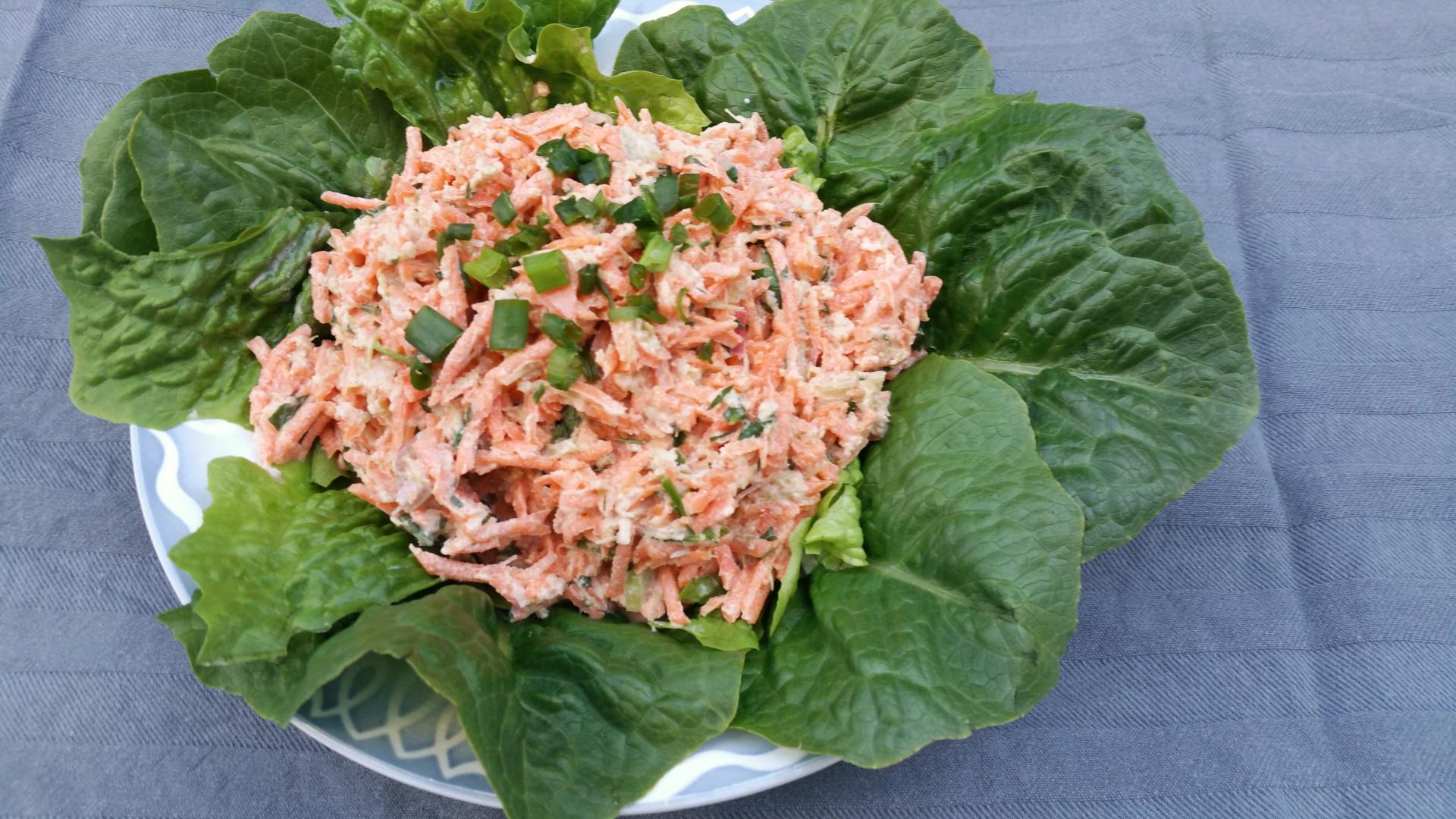 Was de rabarber en snijd in heel kleine stukjes. Ik probeerde de rasp, maar dat was niet zo’n succes. Een scherp mes is beter! Schil de wortel en rasp met een grove rasp. Meng door de rabarber en voeg zure room en zout en suiker toe. Hak de bieslook en peterselie fijn en meng ook door de salade.