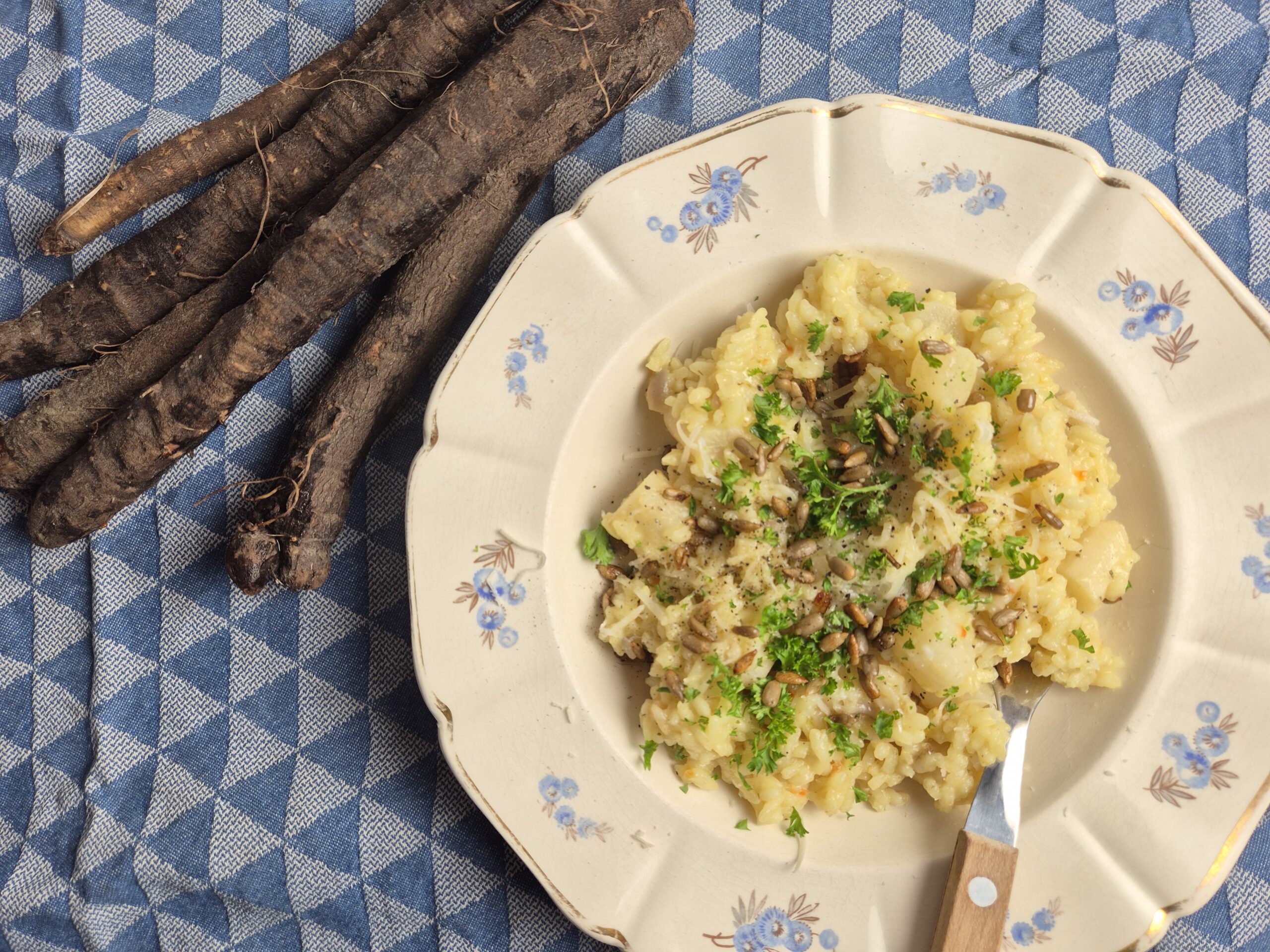 Schorseneren, ze staan in menig chique restaurant op de kaart! Schorseneren worden ook wel armeluisasperges genoemd. Niet dat ze er qua smaak nou zo op lijken, maar met een beetje fantasie lijken ze, geschild en gekookt, inderdaad wel een beetje op asperges. Het is een echte wintergroente, die pas onlangs uit de grond is gehaald door onze overburen van Arenosa. Op deze site vind je allerlei inspiratie, zoals soep en pasta met schorseneer, maar ook deze risotto kan ik je aanbevelen!