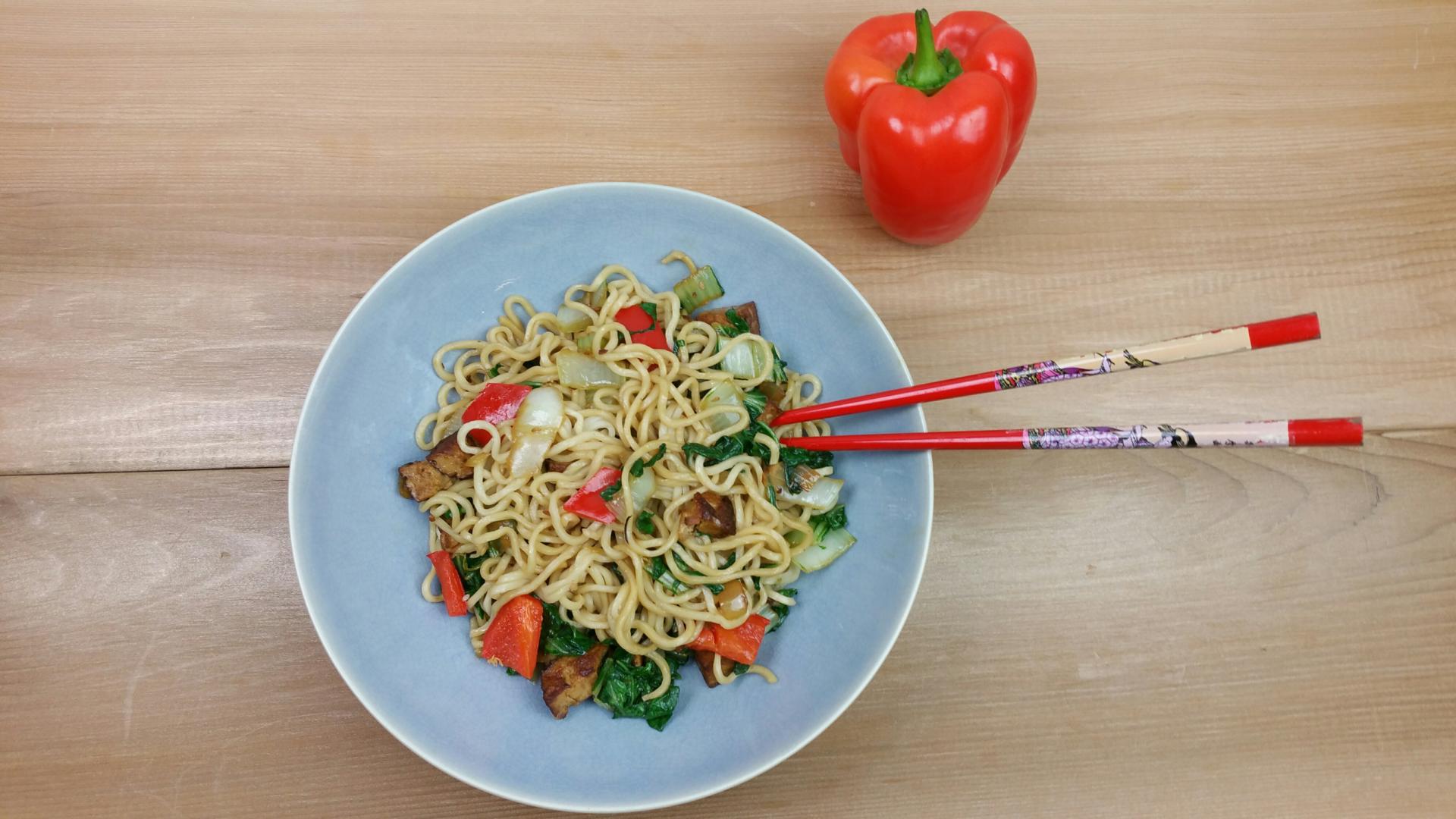 1 grote paksoi; 1 flinke ui; 1 rode paprika; 1 pakje tofu sesam-amandel; 1 pak mie; olie om te wokken; scheut tamari; scheutje sesamolie; optioneel wat kerrie of Thaise kruidenmix; supers gebruiken ook de shiitakes!