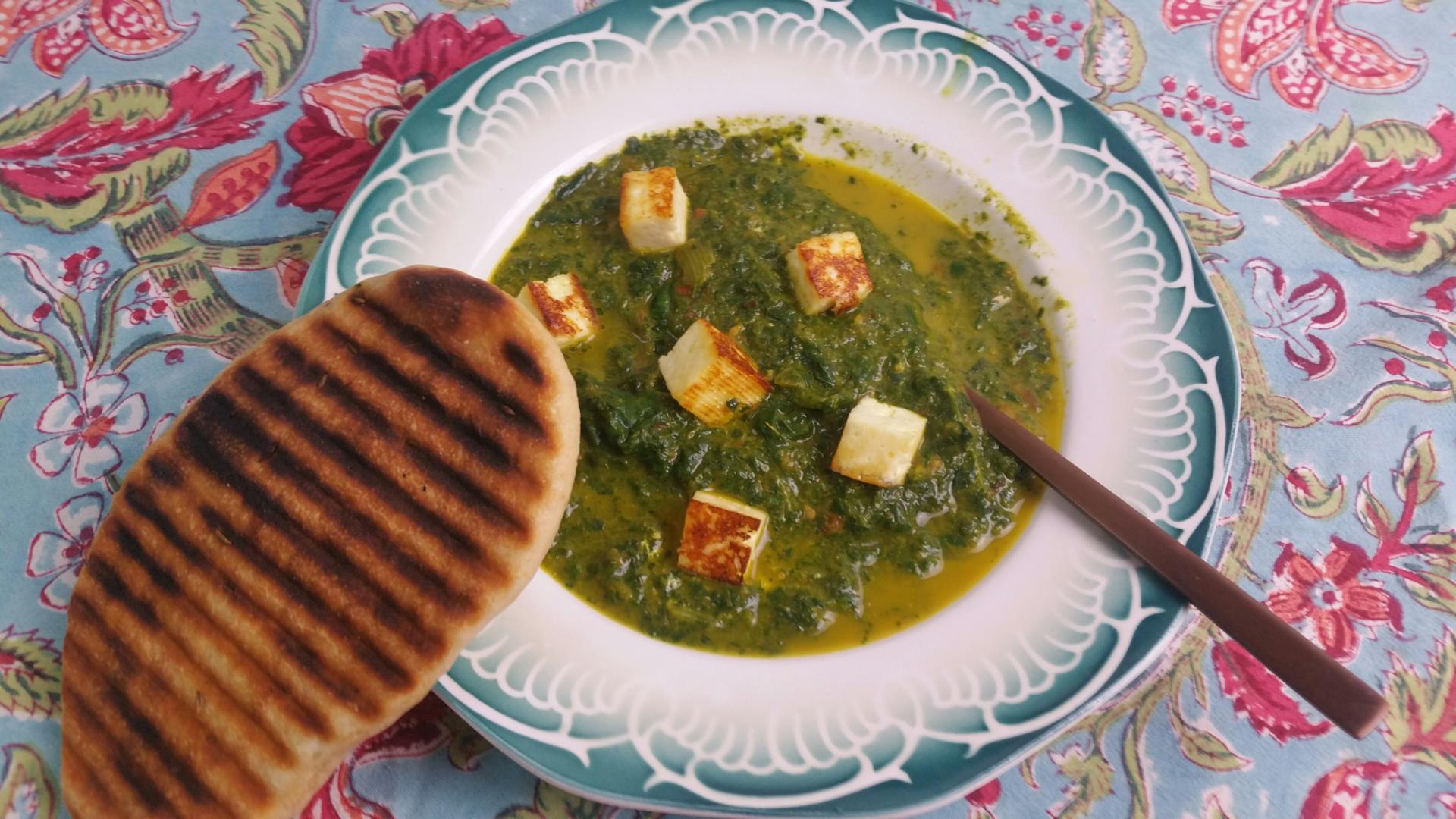 Was en snijd de spinazie. Neem een grote pan en verhit hierin wat olie. Fruit de komijnzaadjes tot ze gaan sputteren. Voeg de uien toe en bak ze tot ze glazig zijn en voeg dan knoflook, garam masala, kurkuma, gember en peper toe en roerbak 2-3 min, tot het mengsel geurig wordt. Voeg vervolgens de gesneden spinazie toe, doe er een scheut water bij en zet het vuur lager als het begint te koken. Dek af en laat de spinazie stoven tot het zacht is. Roer dan de tomaten door spinazie en laat nog even pruttelen totdat ze goed warm zijn geworden. Als je wilt maal je dit mengsel fijn met de staafmixer tot een dikke, gladde saus. Snijd de paneer in blokjes van 1 à 2 cm en bak ze lichtjes aan in wat olie. Bak niet te lang door, want dan wordt de paneer taai, er moet net een licht kleurtje op komen. Roer de crème fraîche of yoghurt erdoor, schep goed om en voeg de paneer toe, laat nog even sudderen. Serveer met witte (basmati)rijst en naanbrood.