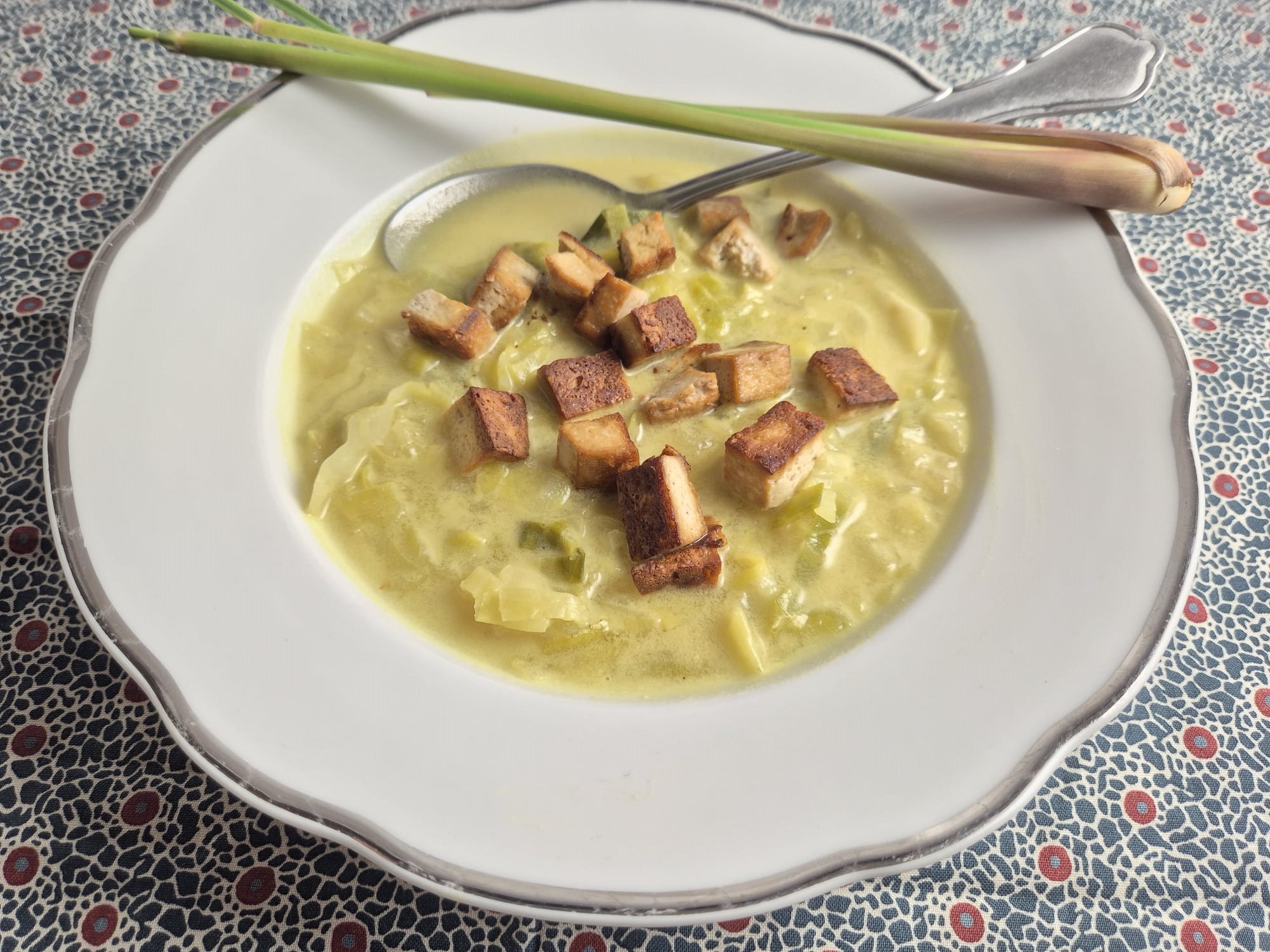 Snijd de tofu in kleine blokjes en marineer in een kom met 2 el tamari. Pel ui en knoflook en snipper beide fijn. Verwarm de kokosolie in een soeppan en fruit op zacht vuur de ui en knoflook. Snijd het voetje van de stengel citroengras en ook het bovenste stuk, dat mag bij de ui in de pan. Pel het het buitenste deel van de stengel, doe die ook in de pan en hak het binnenste deel zo fijn als je kunt. Snijd ook 3 plakjes gember en doe dit samen met een bouillonblokje, de kokosmelk, kurkumapoeder en 6 dl water in de pan. Laat aan de kook komen en kook met een deksel op de pan voor 20 min. zodat de smaak goed vrijkomt. Intussen was je de spitskool, snijd de kern er uit en snijd in fijne reepjes. In een koekenpan verhit je een lepel kokosolie en bak je de tofublokjes krokant. Doe de kool bij de soep (misschien wil je niet alles gebruiken) en kook 5- 10 min. tot je de kool zacht genoeg vindt. Vis de stengels citroengras en de gemberplakjes uit de soep (als je ze kan vinden) en serveer elke kom soep met een schep tofublokjes.