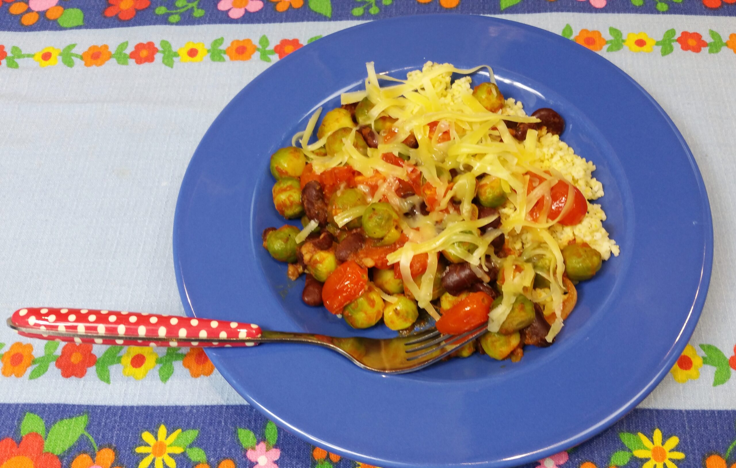 Maak eerst de spruitjes schoon, een redelijk tijdrovend klusje. Mijn tip: haal je puberende zoon of dochter erbij en doe het samen. Kun je meteen een beetje bijpraten! Pel de ui en knoflook en snipper beide fijn. Laat de kidneybonen uitlekken in een zeef en halveer alvast de tomaatjes. Stoom de spruitjes beetgaar in een minuut of 8. Verwarm een scheutje olie in een pan en bak ui en knoflook glazig. Voeg kruiden toe en de tomatenpuree en een beetje (1 of 2 keer het volume van het tomatenpotje) water. Intussen zijn ook de spruitjes bijna gaar, prik even. Voeg de kidneybonen toe aan de tomaat en ook de gehalveerde cherrytomaatjes. Meng de spruitjes erdoor en proef voor p&z. En moet er nog wat vocht bij? Wij aten deze spruitjes met gierst en wat geraspte kaas ervoer, maar rijst of pasta zullen er ook goed bij smaken!