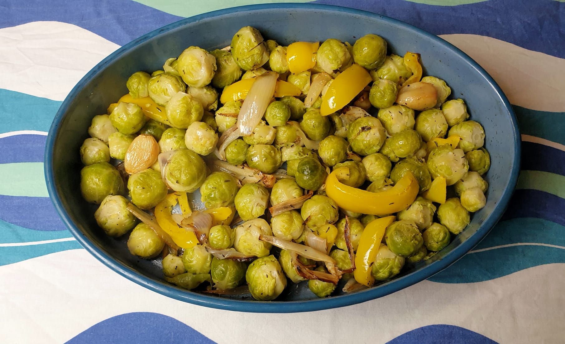 700 g spruitjes, zakje sjalotjes, 4 flinke tenen knoflook, 1 gele paprika, olijfolie, 1 tl tijm, p&z