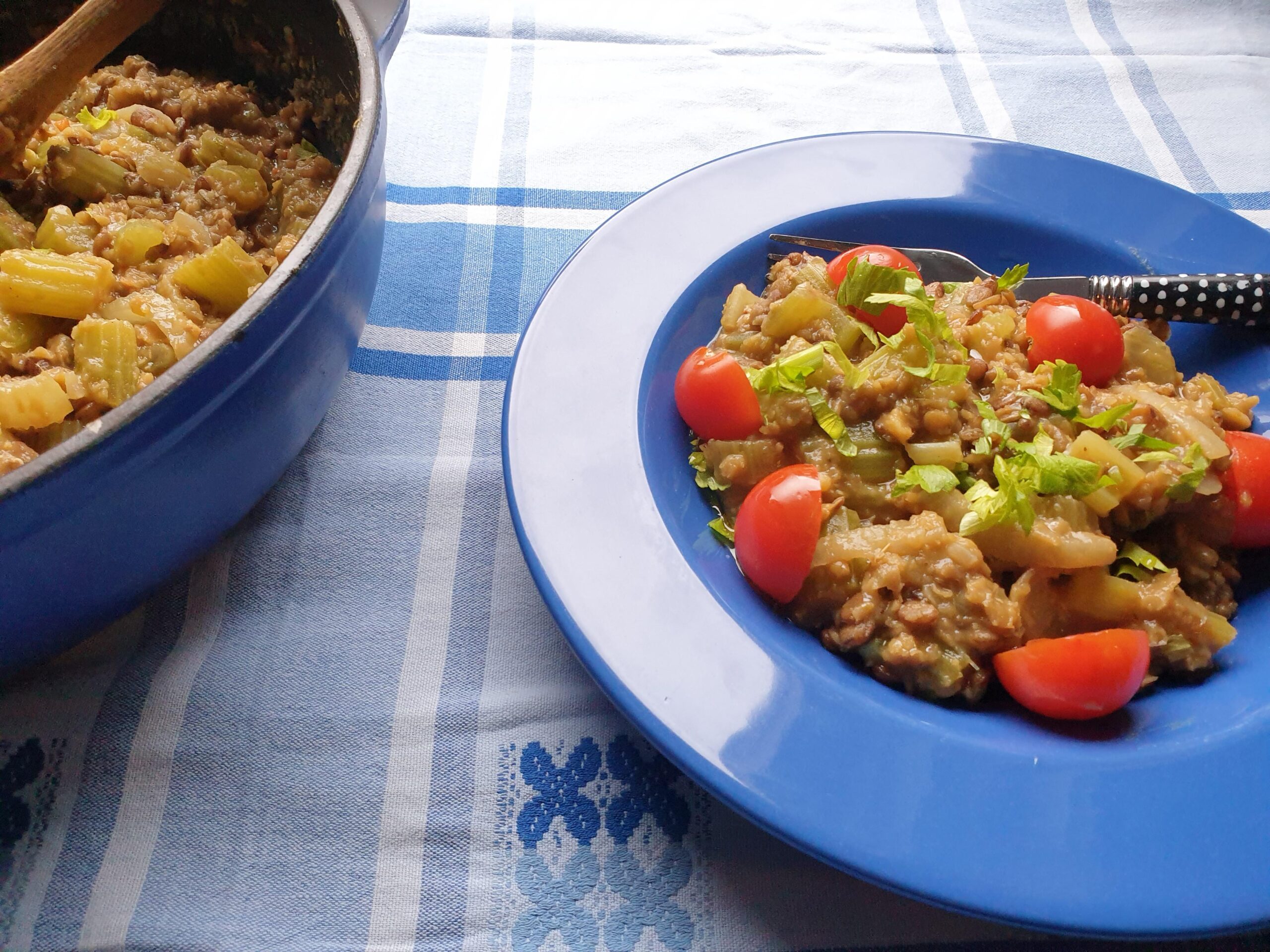 1 struik bleekselderij, 100 g bruine Puy-linzen, 100 g oranje linzen, 2 uien, 1 tl komijnzaad, 3 tenen knoflook, 1 tl gehakte verse gember, 2 tl korianderzaad, stukje rode peper of gedroogde rode peper, olie of kokosvet, 1 tl komijn, 2 tl venkelzaad, 1 bouillonblokje, p&z