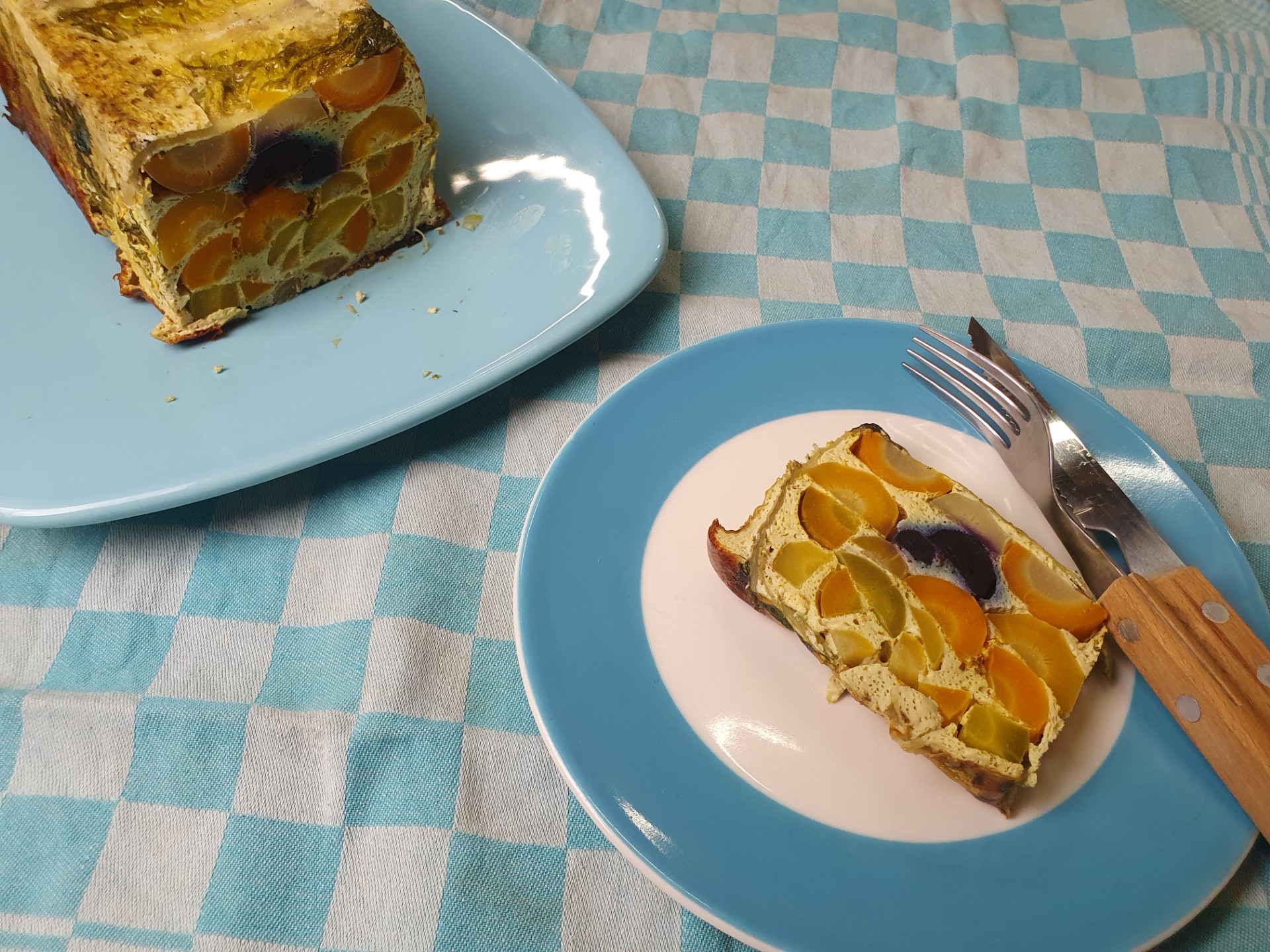 De regenboogpeen vind ik het meest geschikt om lekker in de oven te roosteren, een recept vind je hier. Maar ja, ik wil ook graag nieuwe dingen blijven uit proberen en een terrine leek me een leuk gerecht. Ik heb het gerecht niet zelfbedacht hoor, maar wel uitgetest en – uiteraard -een beetje aangepast. De komijnzaadjes zijn best overheersend in het geheel, ik houd er van, maar wil je het wat subtieler, gebruik dan beter een beetje komijnpoeder. Ik maakte het zonder kaas, maar een beetje geraspte kaas zou er ook goed in smaken, gebruik niet te veel, ik zou zeggen maximaal 100 gram.