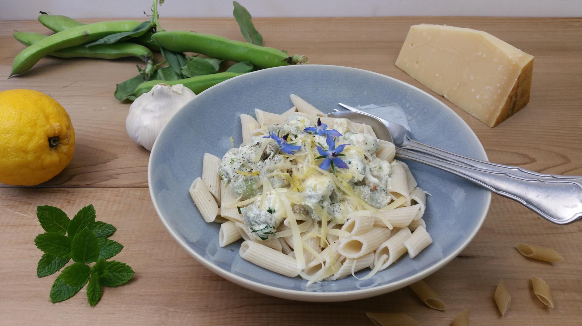 1 zak tuinbonen, flinke scheut droge witte wijn, 2 el olijfolie, 350 g pasta, 2 tenen knoflook, 200 ml (soja)room, handvol verse munt (de blaadjes), stukje Parmezaanse kaas, 1 citroen, 100 g biologische spekjes, peper
