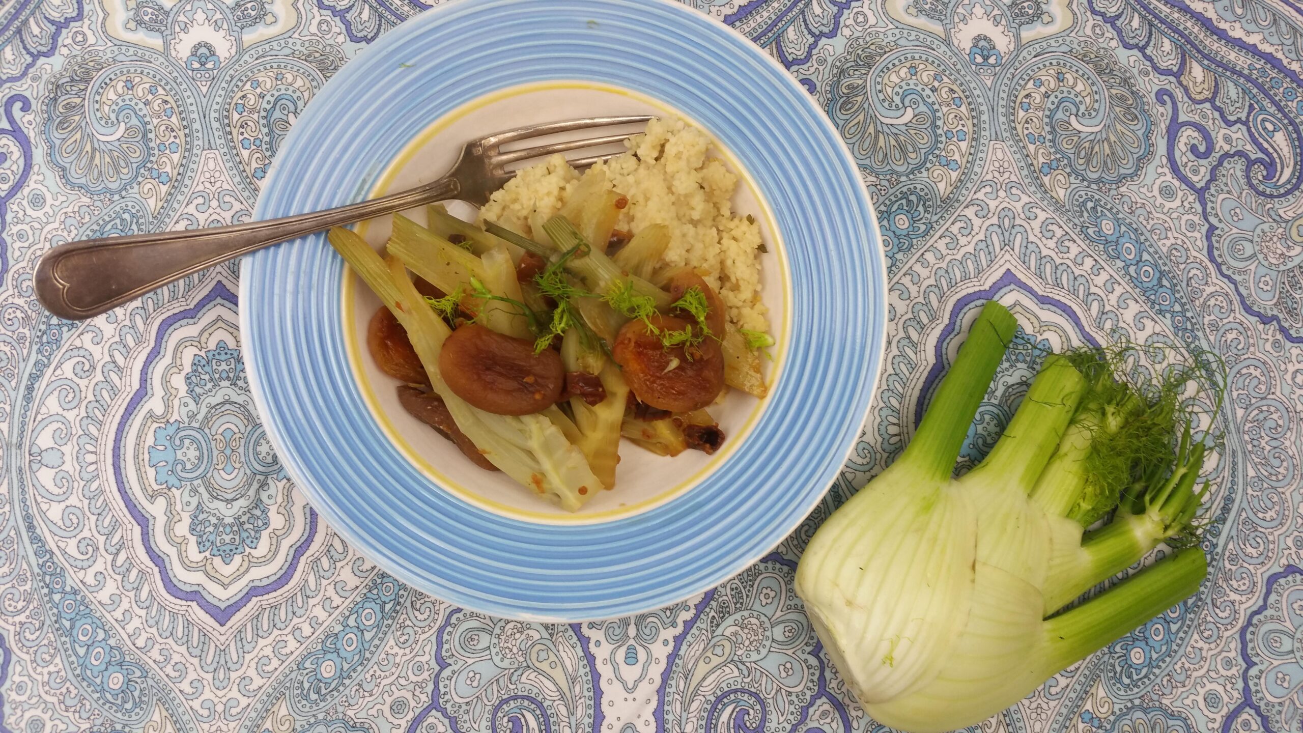 Week de abrikozen met het venkelzaad minimaal een uur in een kommetje met heet water, een hele dag kan ook, dus zet ze alvast ’s ochtends voor je de deur uitgaat even klaar. De tomaten hebben iets minder lang nodig, 15 min. is genoeg. Was de venkel en trek de draadjes ui de buitenste rokken. Snijd doormidden in dan in partjes, of in boogjes, wat je wilt. Stoom de venkel gaar. Snijd de geweekte tomaatjes in stukjes en verwarm ze in een pan met een beetje weekvocht van de abrikozen. Meng de abrikozen erbij (misschien wil je die halveren?) en de venkel en wat p&z. Lekker met couscous.