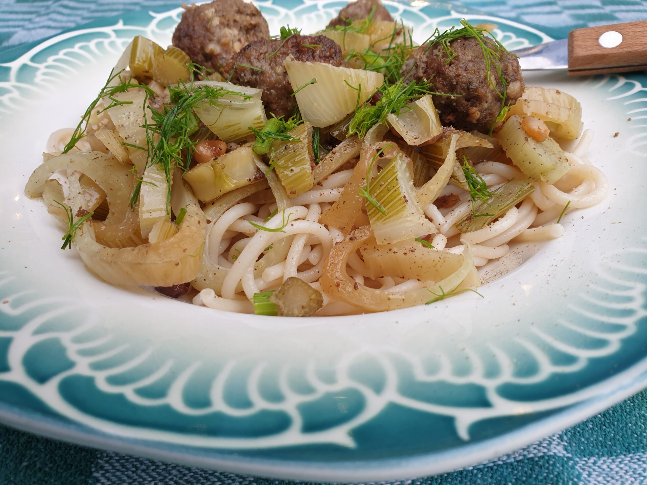 700 g venkel, 2 tenen knoflook, 2 el rozijnen, 2 el pijnboompitjes, 4 el olijfolie, 100 ml witte wijn, 350 g pasta, Voor de gehaktballetjes:, 300 g gehakt, 1 tl zout, peper, 1 tl venkelzaadjes, 1 ei, handvol havermout of kopje broodkruim