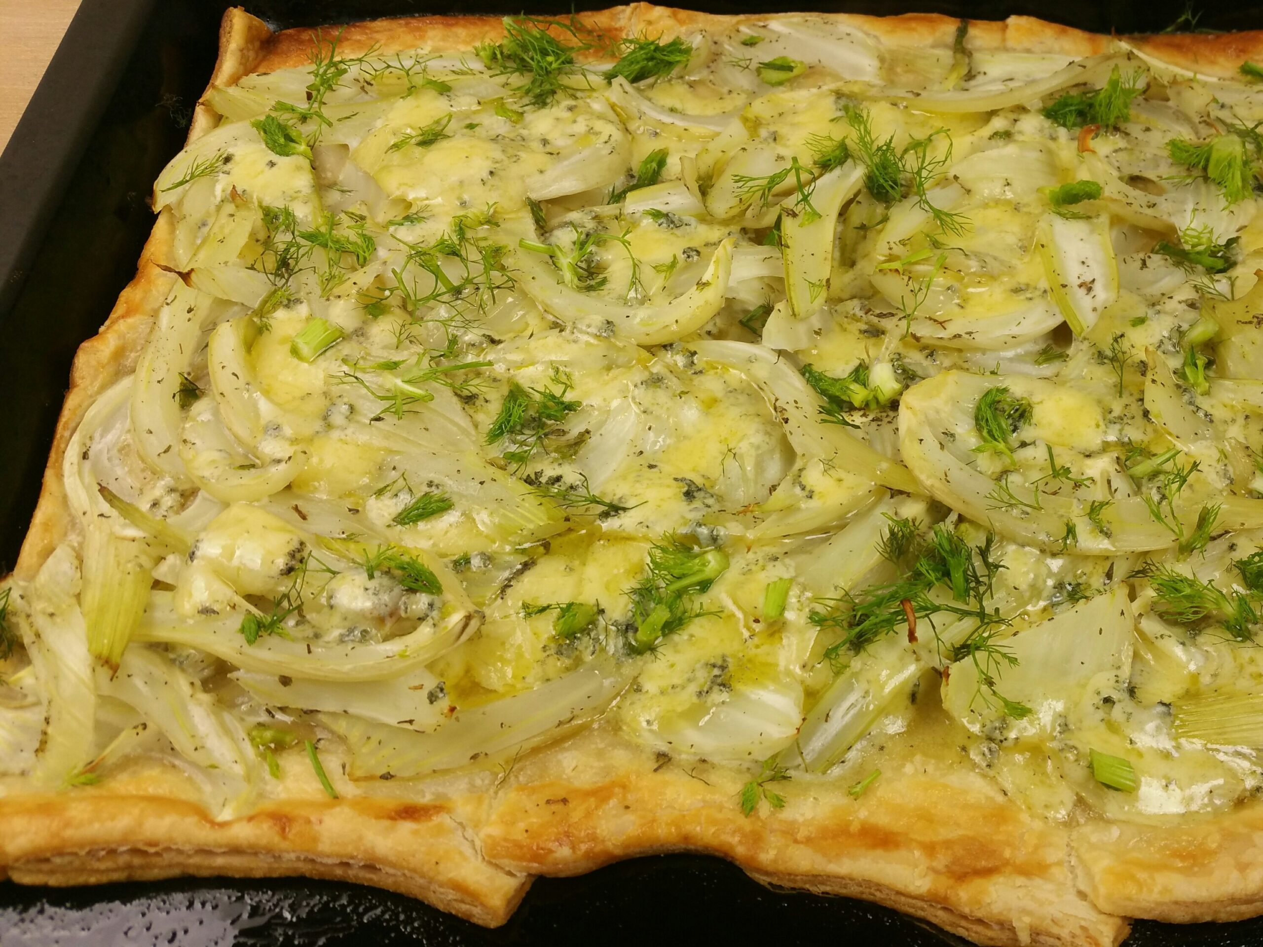 500-700 g knolvenkel, 1 ei, 1 tl tijm, 100 g blauwe kaas, 1 pakje dieprvriesbladerdeeg, scheutje olie of vel bakpapier, p&z.
