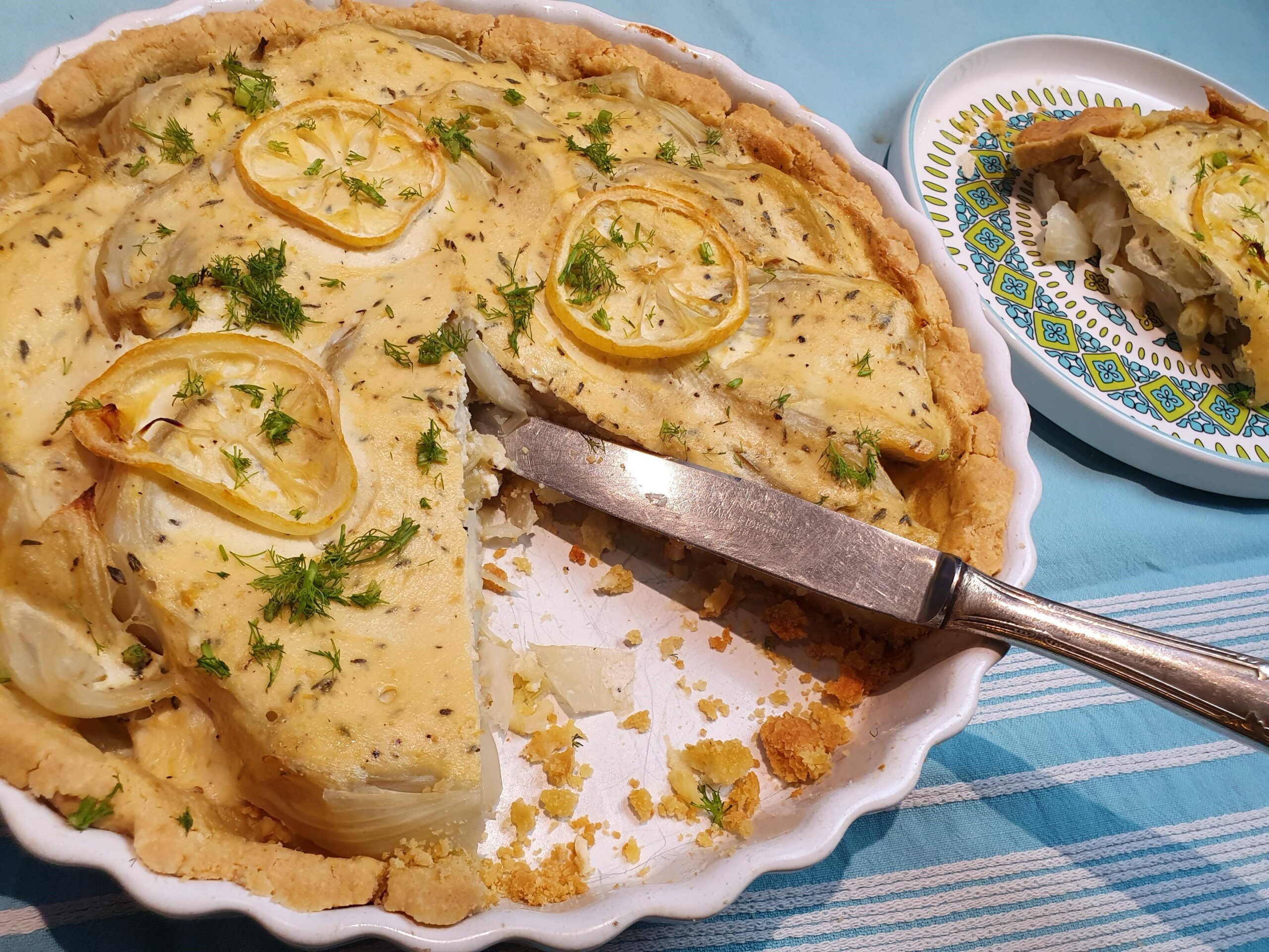 Venkel of knolvenkel is als je wilt een heel snelle groente: in stukjes gesneden, gekookt, met een lekker kaassausje en een portie pasta, ben je in 20 min. klaar. Iets bewerkelijker is bijvoorbeeld risotto, waar venkel zich erg goed voor leent. Deze keer liet ik me inspireren door de citroen in het pakket en zo kwam ik op deze hartige taart. Ik ben een beetje aan het experimenteren met glutenvrij koken en hartige taarten maken is best wel spannend. Ik ben nog niet geheel tevreden over de samenhang van het deeg (voor tips houd ik me aanbevolen), maar de smaak was uitstekend. De citroen geeft het geheel een lekker frisse toets, zorg wel dat je goed p&z gebruikt, want dat heeft de taart wel nodig. Wij aten er een frisse salade bij van andijvie, tomaat en kappertjes en dat was een prima combinatie.