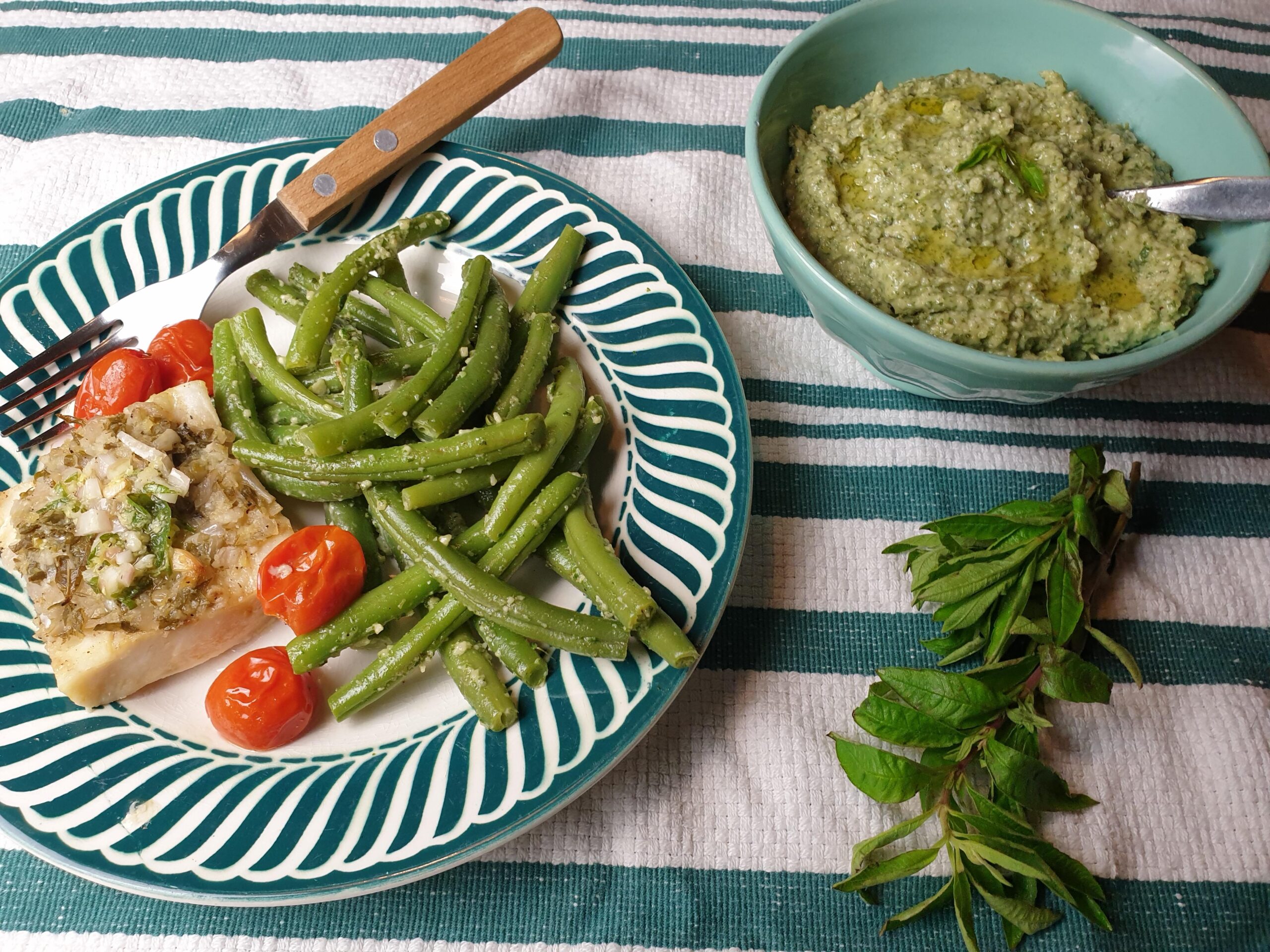 Verbena, of Verveine, zoals het in Frankrijk heet, is daar een geliefd kruid voor een ‘infusion’: een lekkere kruidenthee. Het is fris, citroenig en prefect op zomerse dagen…. maar ook perfect om nog even terug denken aan die zomerse dagen! Ik maakte er een heerlijke pesto mee en die smaakt formidabel op gestoofde koolraap, op gestoomde boontjes en ook op knolselderij en bloemkool vonden we hem heel lekker. Op broccoli heb ik hem nog niet getest, maar het lijkt me dat ook dat prima kan! Natuurlijk kun je hem ook combineren met een tomatensalade, zoals je ook met basilicumpesto doet. Gewoon simpel wat blaadjes fijn hakken en op het laatst toevoegen aan koolraap smaakt ook heel goed en je kunt er ook een leuke marinade voor kip of vis mee maken. En natuurlijk gewoon een lekker theetje zetten en even terugdenken aan die zomerse dagen, terwijl buiten de regen tegen de ramen klettert… In Nederland heet dit blaadje trouwens ook wel pleuriskruid, goed bij hoest!