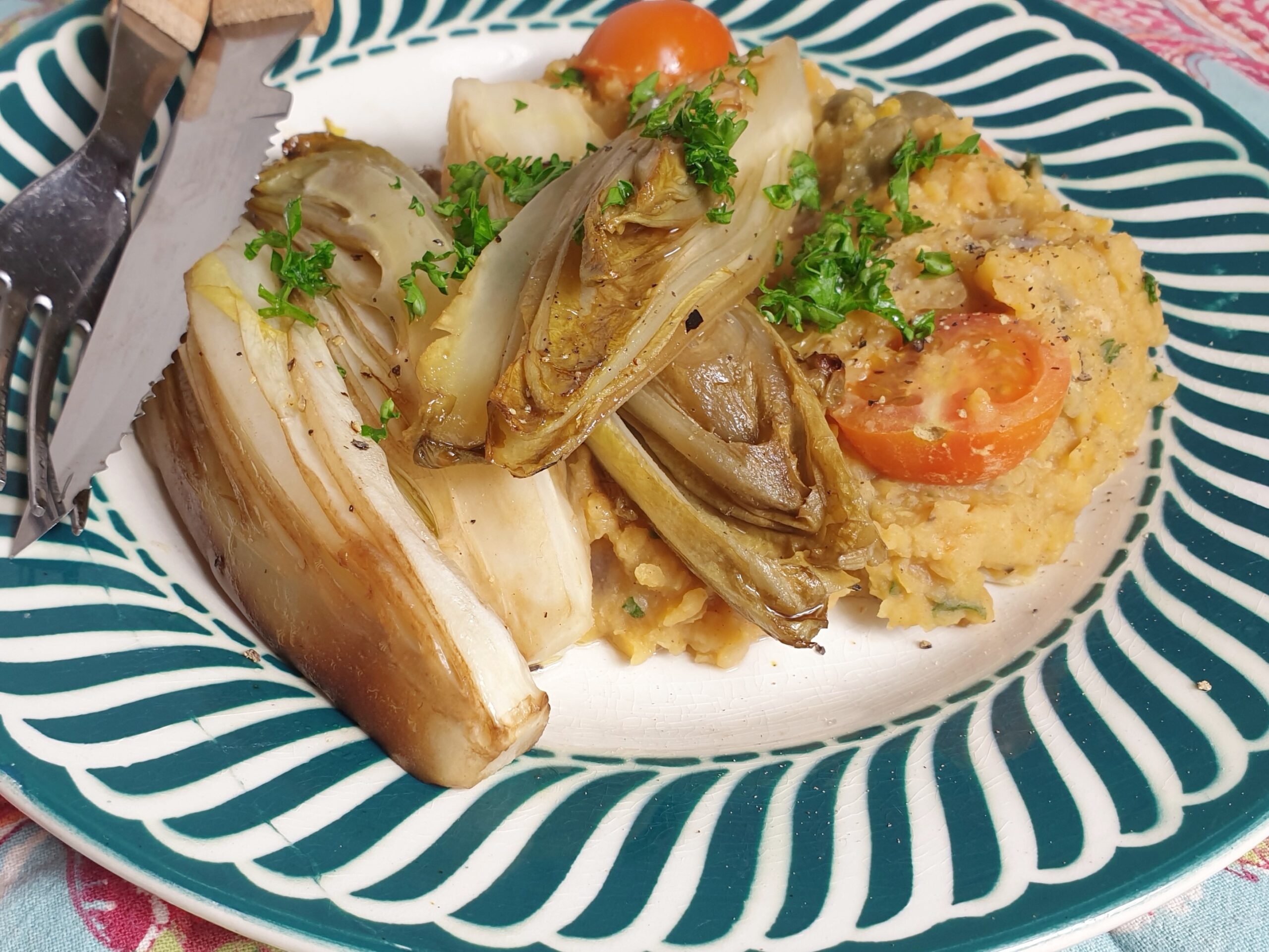 Pel ui en knoflook en snipper beide fijn. Maak de witlof schoon en snijd in kwarten, snijd de onderkant maar een klein stukje af, zodat de blaadjes bij elkaar blijven. Verwarm een schut olie in een of twee koekenpannen en verdeel de witlof erover, met de snijvlakken op de bodem. Neem een derde pan en fruit daar, in een scheut olie, de ui en knoflook glazig. Was de linzen en voeg ze toe aan de ui. Voeg de komijn, tijm, oregano en kaneel toe en een grote beker water, zoveel dat de linzen net aan onderstaan. Keer de witlof om en sprenkel er een beetje balsamicoazijn over. Leg een deksel op de pannen en smoor op laag vuur zacht. Roer regelmatig in de linzen en voeg zo nodig wat meer vocht toe. Het moet een dikke, puree-achtige substantie worden. In 15-20 min. zijn de linzen waarschijnlijk zacht genoeg. Halveer de tomaatjes of snijd de tomaat in stukjes en warm ze mee en voeg ook de kappertjes toe. Was de peterselie en hak fijn. De helft roer je door de linzen, de andere helft gebruik je straks te garnering. Schep op elk bord een schep linzen en leg daar de gebakken witlof bovenop. Strooi er wat peterselie over.