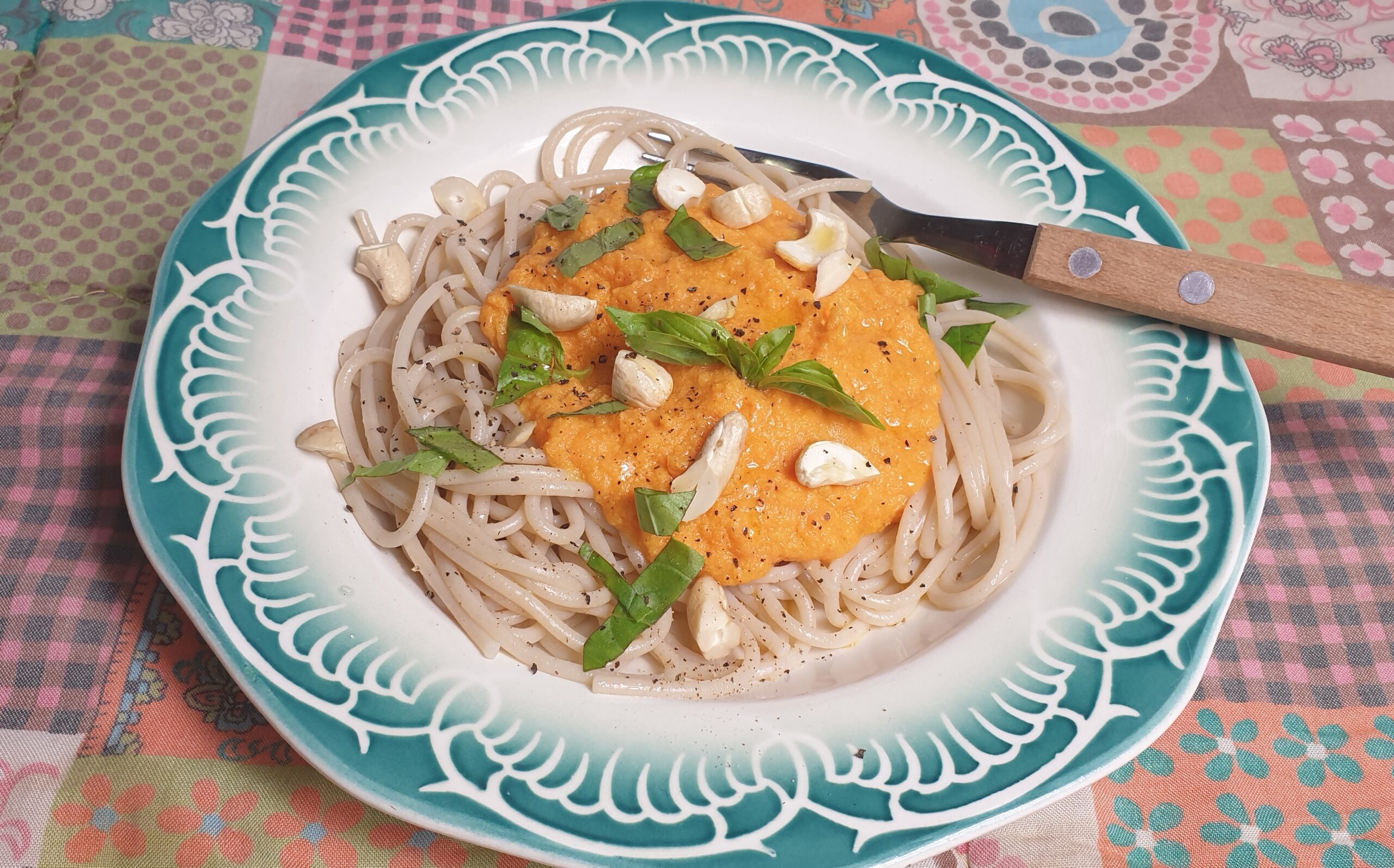 Zijdentofu is heel zachte tofu, waar je prachtige dingen mee kan doen. Bijvoorbeeld in een hartige taart zoals deze, of een kunstig gerecht zoals dit. Ook wordt het in de veganistische keuken gebruikt in zoete baksels, wat ook mijn plan was toen ik het weer eens kocht. Maar toen maakte ik toch appeltaart en nu mocht de tofu in met de wortels in een prachtige, zachte saus. Als je hem nou serveert op mooie oranje linzenpasta, mijmerde ik, maar dochters prefereerden ‘gewone’ spaghetti. Oké, ook goed! Op gierst of rijst zal het vast ook goed smaken. Lekker met een frisse groene salade erbij.