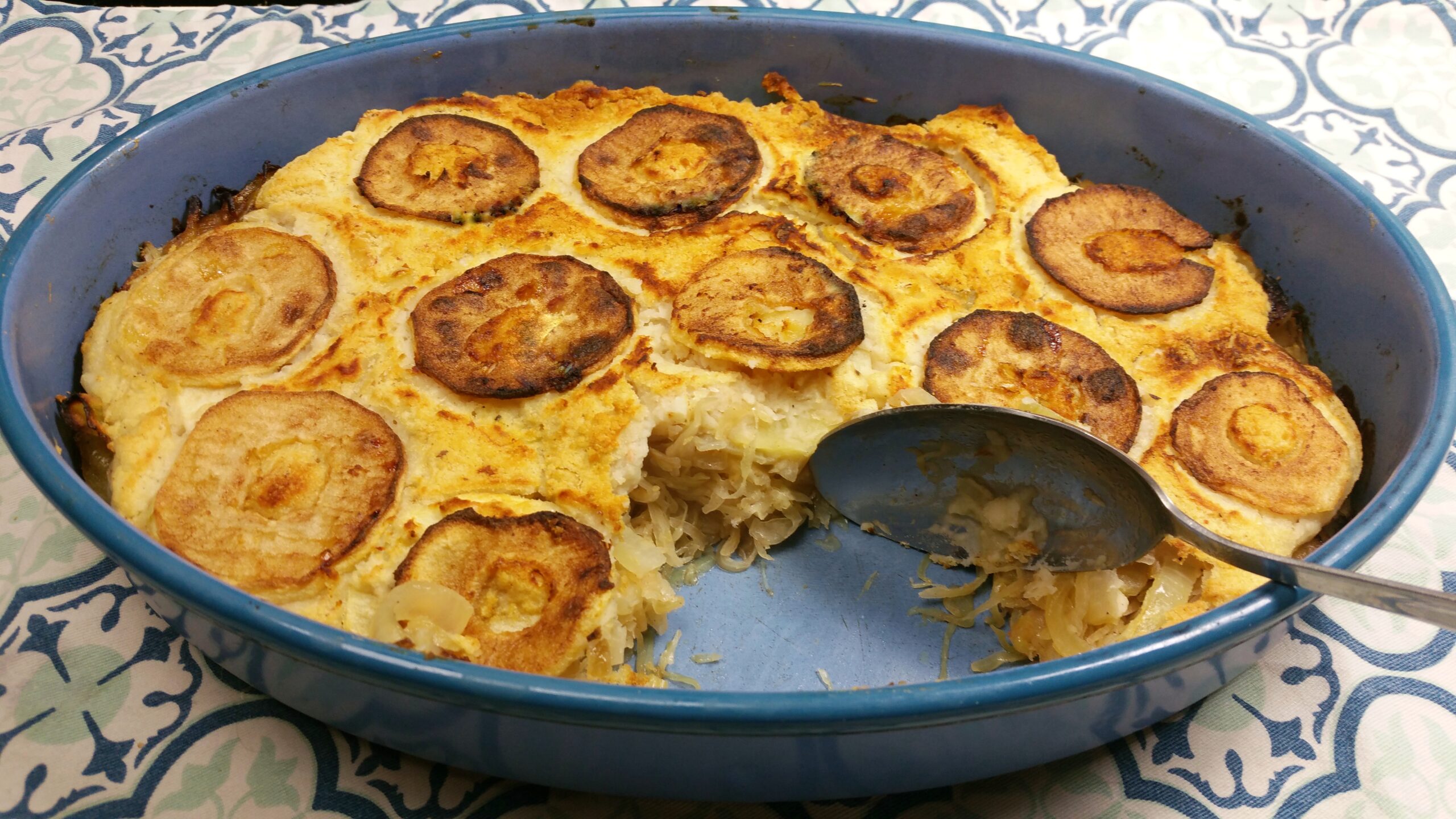 Zuurkool zonder worst, dat kan echt! En ook de aardappels ontbreken, maar ziet het er niet prachtig uit? Mocht je denken dat je niet genoeg aan deze ovenschotel hebt, dan is gebakken pompoen uit de oven en een frisse, groene salade een goede aanvulling.